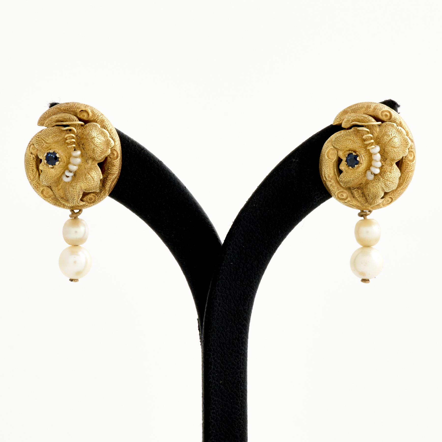 A PAIR OF VICTORIAN PEARL AND SAPPHIRE EARRINGS IN 18CT GOLD, TO POST AND BUTTERFLY FITTINGS, 3.71GMS