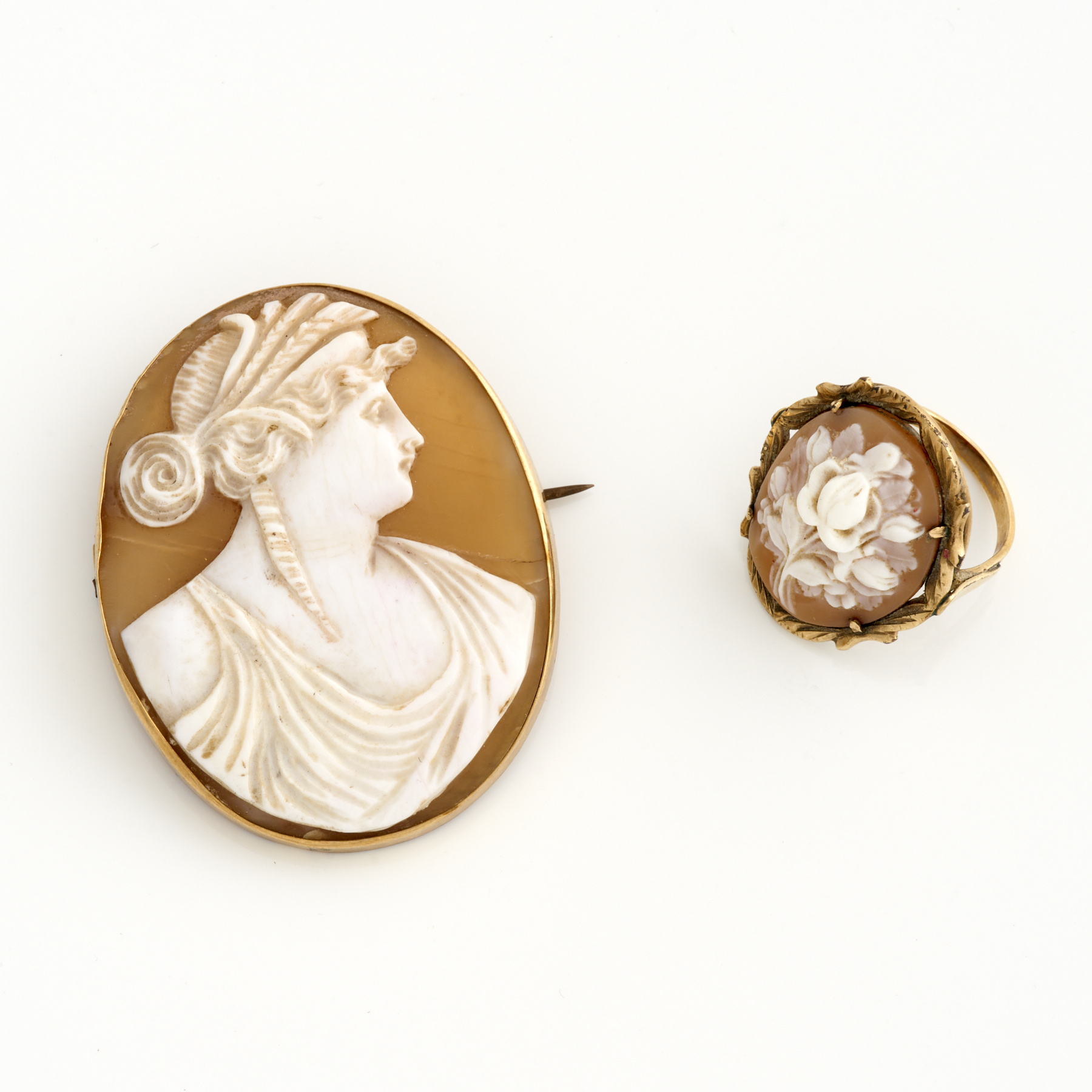 A CAMEO BROOCH IN 9CT GOLD, 48MM X 40MM, TOGETHER WITH A CAMEO RING IN 9CT GOLD, SIZE K, TOTAL WEIGHT 14.0GMS