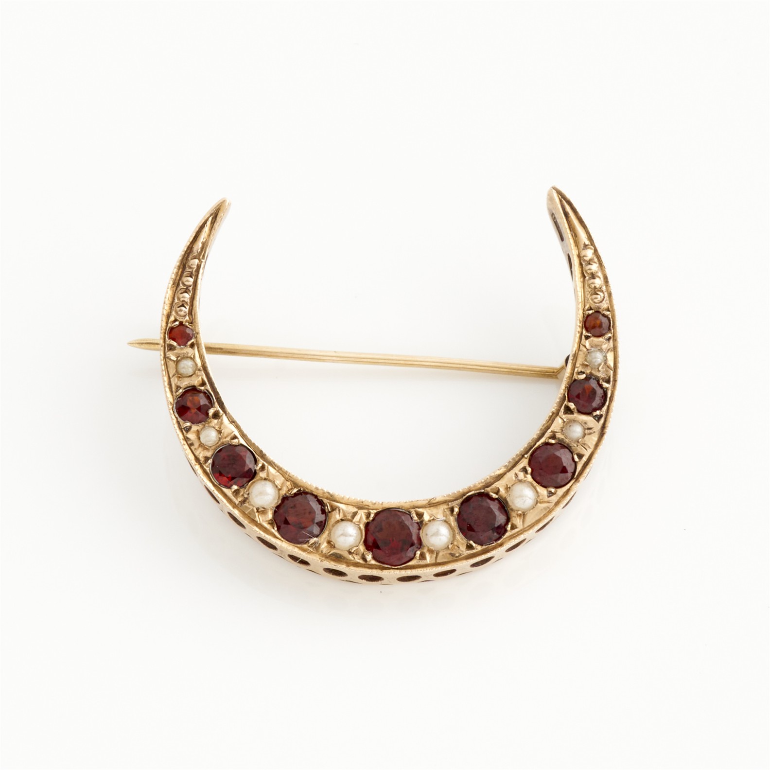 A GARNET AND SEED PEARL CRESCENT MOON MOTIF BROOCH IN 9CT GOLD, 30MM, 3.74GMS