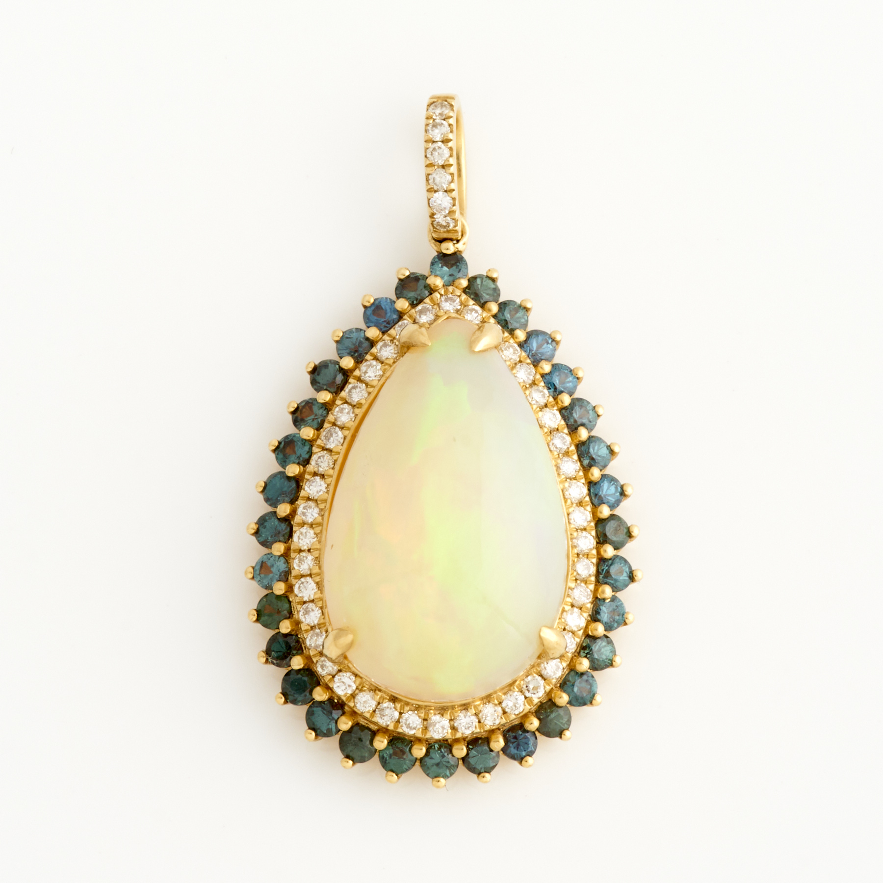 AN OPAL, DIAMOND AND SAPPHIRE PENDANT IN 18CT GOLD, 30MM, 5.99GMS