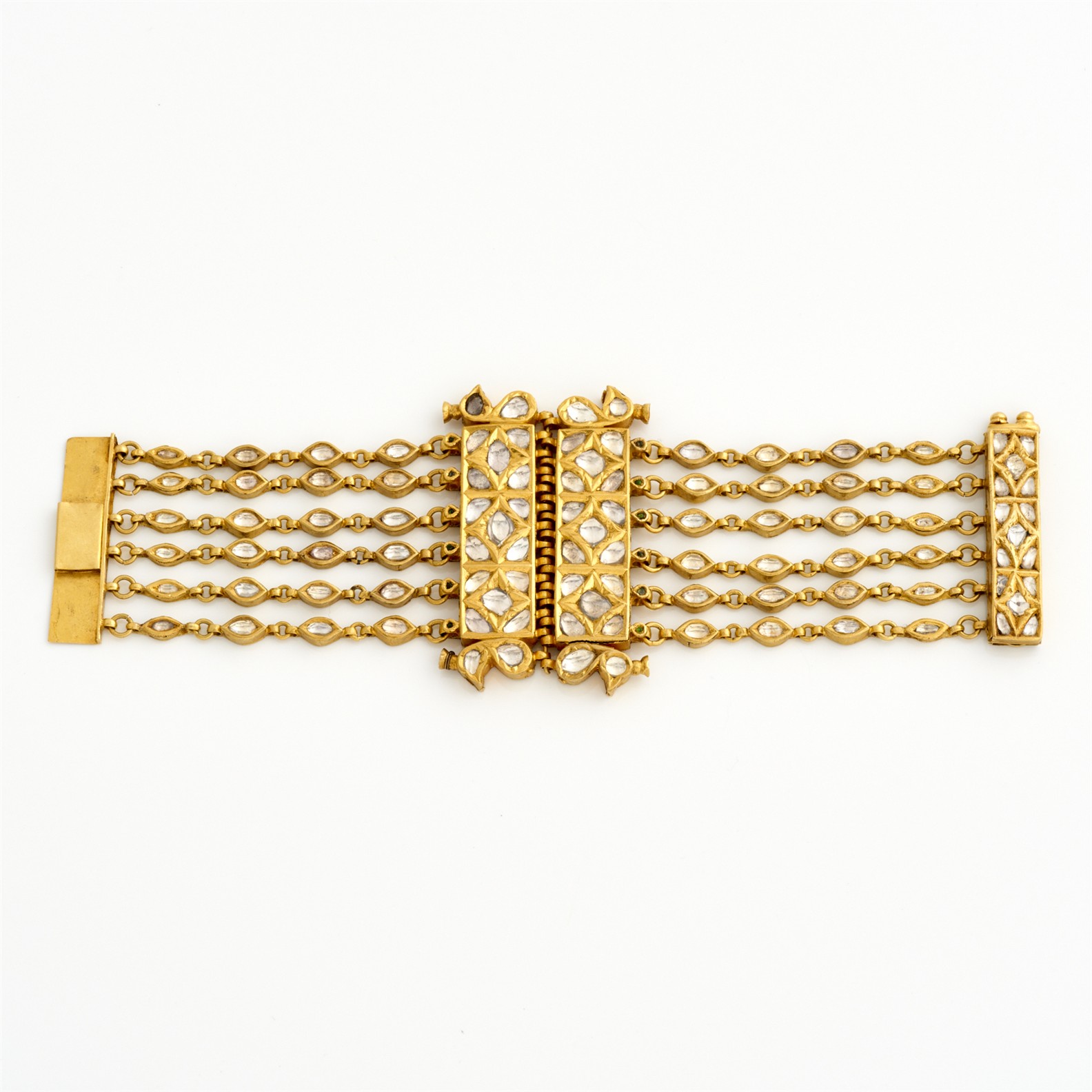 A WHITE SAPPHIRE MULTI STRAND BRACELET IN 22CT AND 18CT GOLD HEAVY GOLD PLATING, TO A TONGUE AND GROOVE CLASP, 60MM IN WIDTH, 180MM IN LENGTH, 124.7GMS