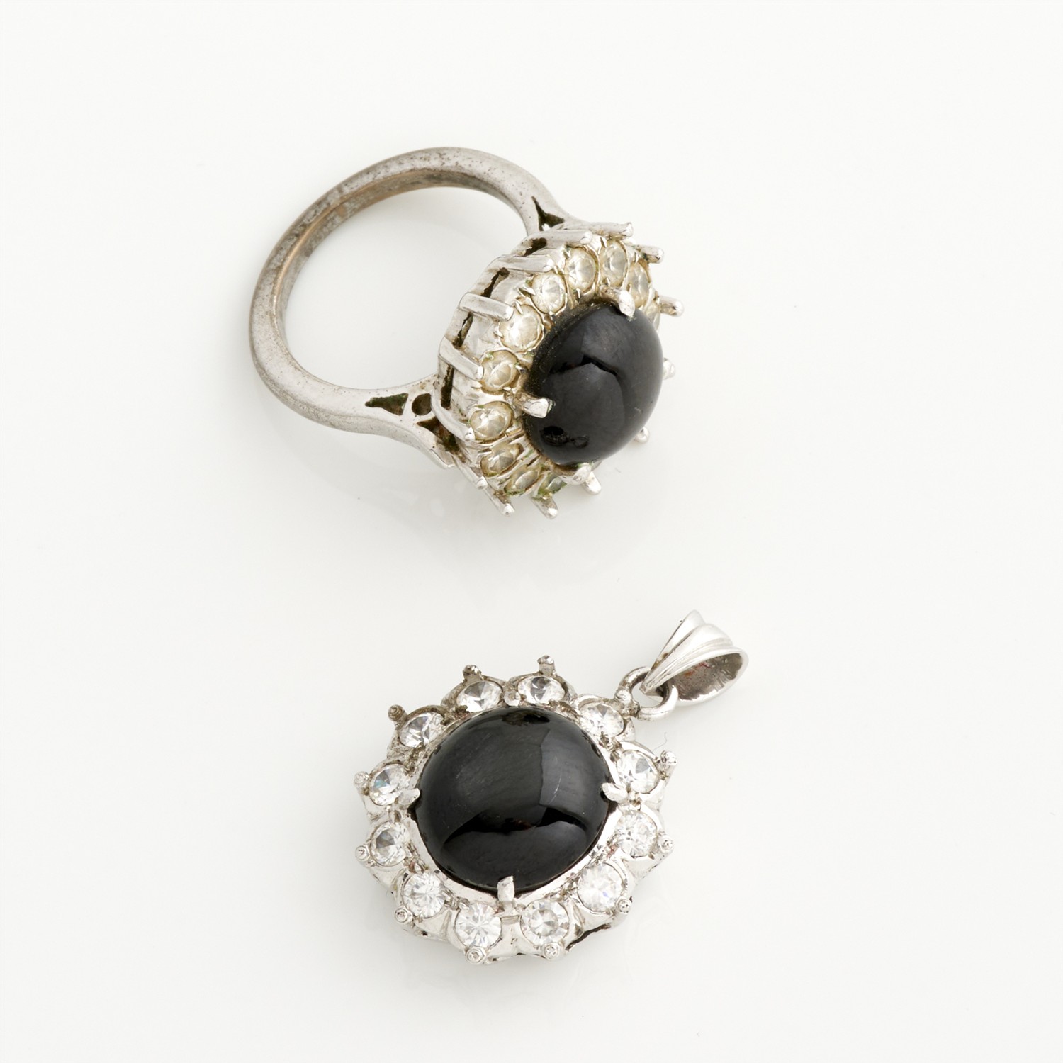 A BLACK STAR SAPPHIRE AND CUBIC ZIRCONIA RING IN SILVER, SIZE L 1/2, TOGETHER WITH A BLACK STAR SAPPHIRE AND CUBIC ZIRCONIA PENDANT IN SILVER 28MM X 20MM