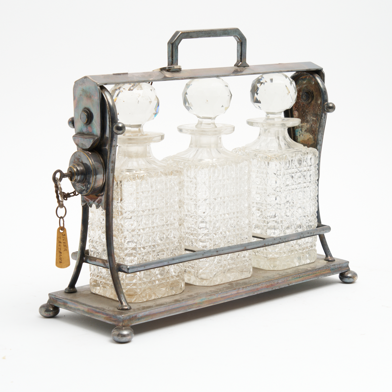 A SILVER PLATE TANTALUS OF THREE CUT CRYSTAL DECANTER (A/F CHIPS) H.30.5CM