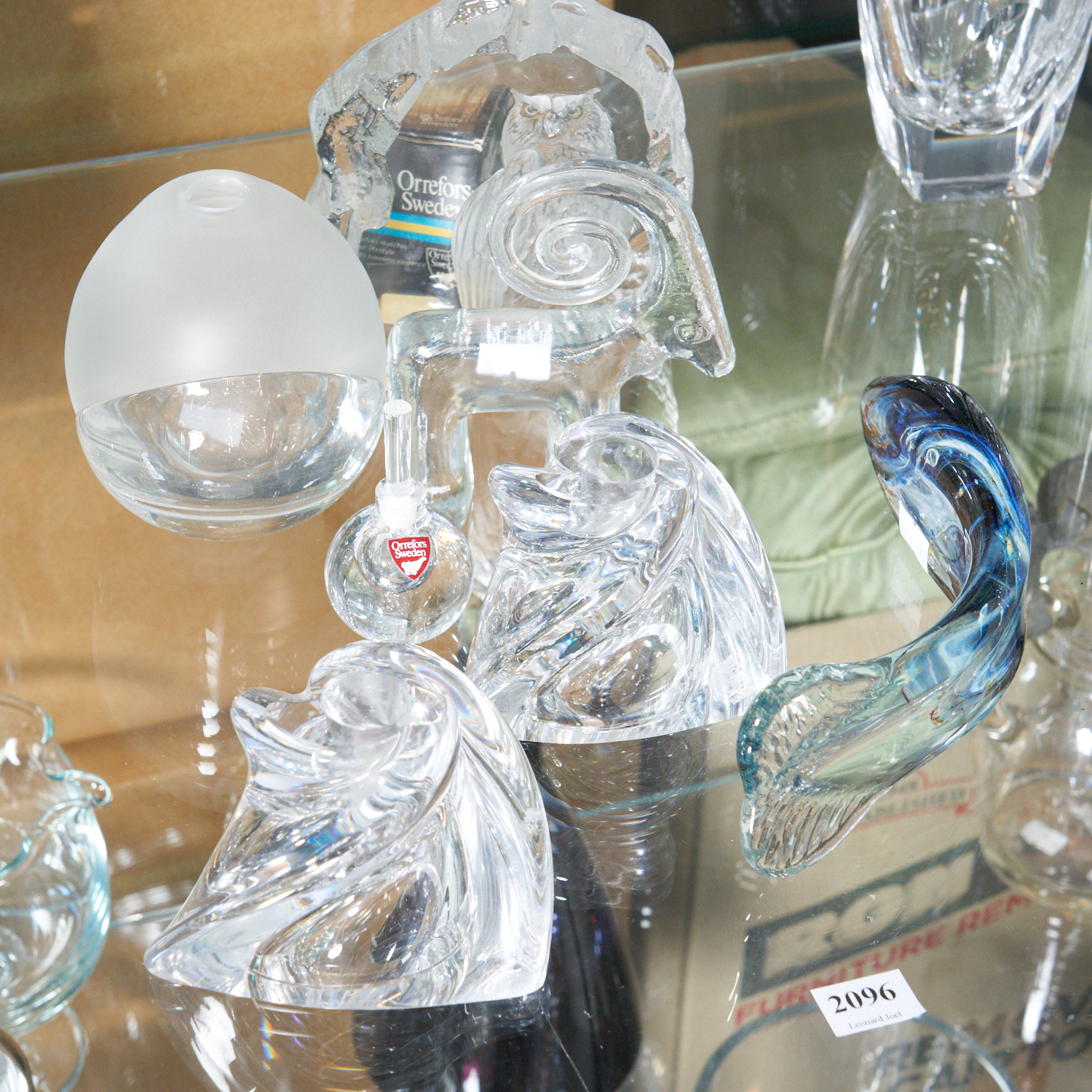 TWO PIECES OF MATS JONASSON CRYSTAL INCLUDING AN OWL SCULPTURE AND A VASE, TOGETHER WITH A PAIR OF VAL ST LAMBERT CANDLESTICKS, TWO GLASS ANIMALS, AND A PERFUME BOTTLE L.21CM (LONGEST)