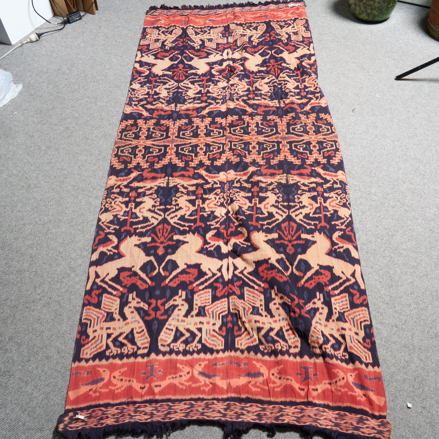 AN IKAT TEXTILE WITH A PATTERN OF HORSES, ROOSTERS AND MYTHICAL CREATURES, FROM SUMBA, INDONESIA 270 X 102CM