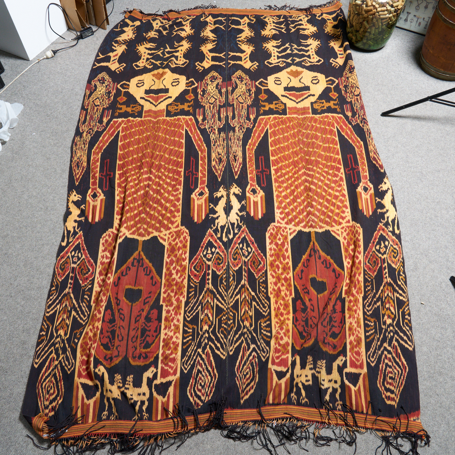 AN IKAT HINGGI KOMBU WITH TWO LARGE STYLIZED FIGURES ABOVE TWO SMALLER FIGURES, SURROUNDED BY GECKOS, SNAKES, AND OTHER CREATURES, F...