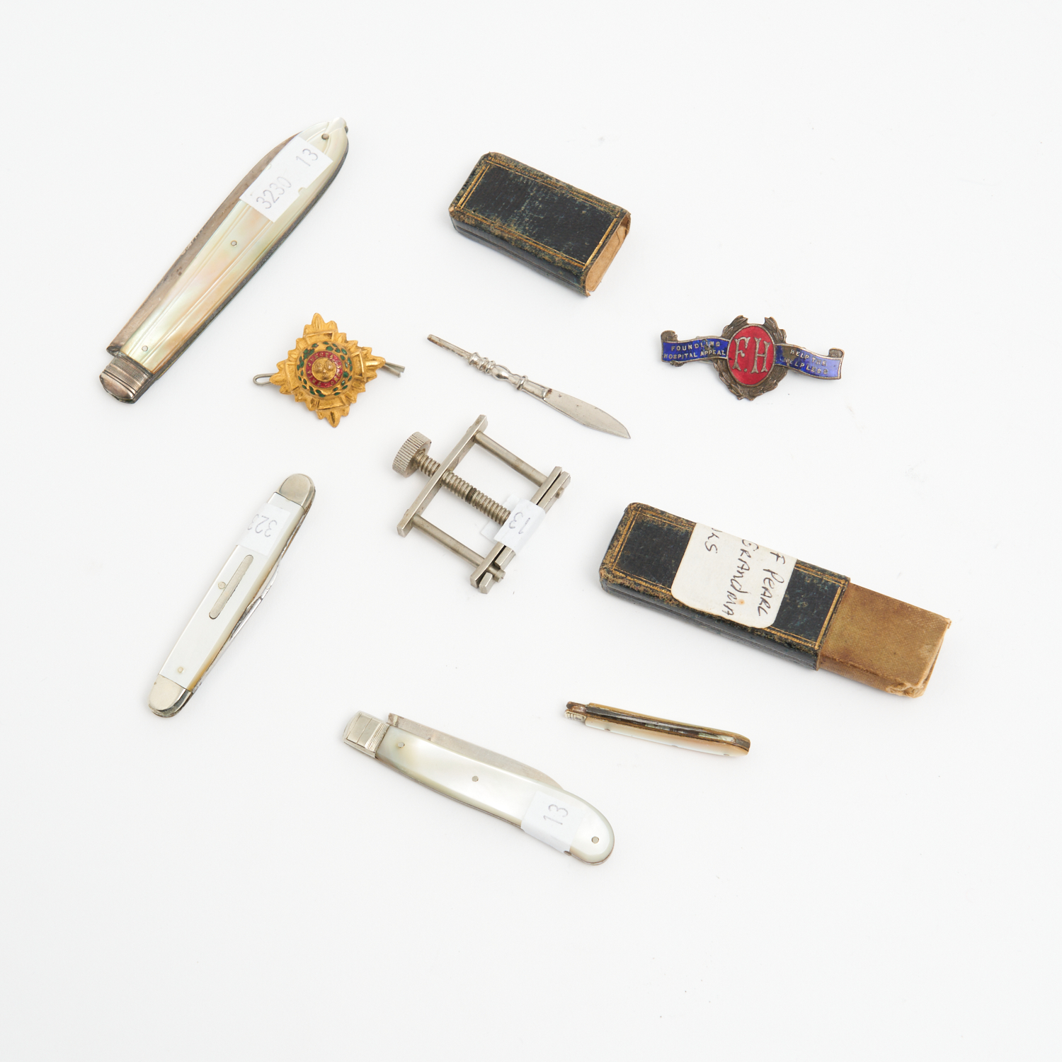 A COLLECTION OF MOTHER-OF-PEARL HANDLE POCKET KNIVES INCLUDING ONE STERLING SILVER BLADED, TOGETHER WITH TWO BADGES AND A MINIATURE VICE/CLAMP
