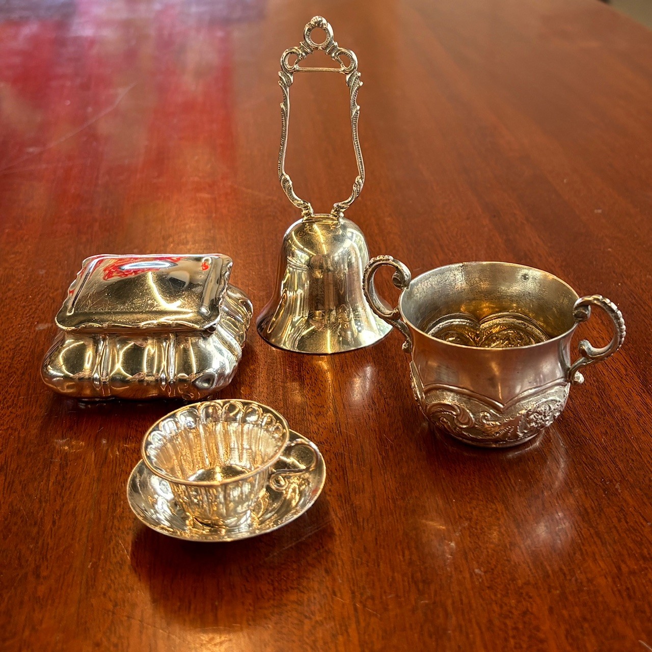 FOUR PIECES OF STERLING SILVER INCLUDING A BELL, A LIDDED BOX, AND TWO CUPS 120G H.10CM (TALLEST)