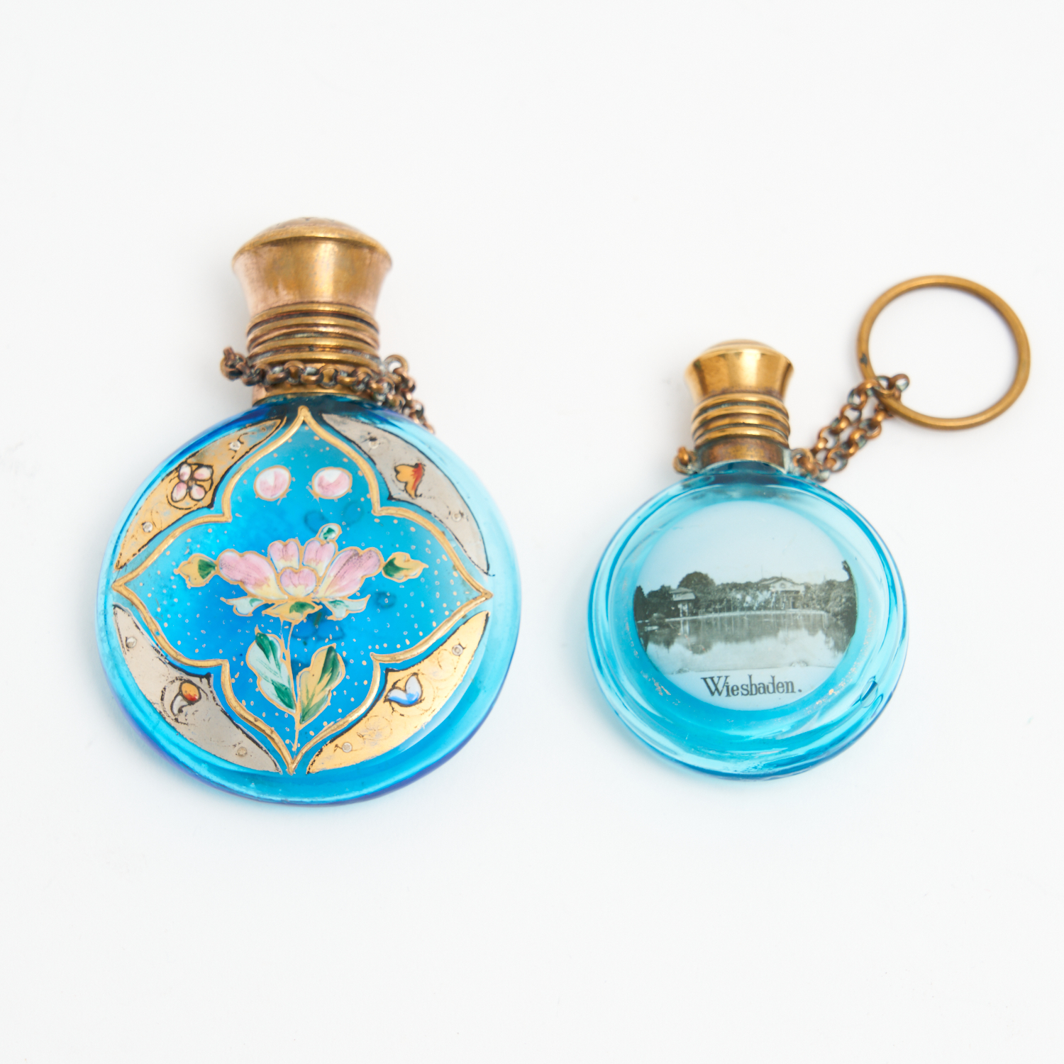 TWO 19TH CENTURY HANDPAINTED GILT METAL MOUNTED BLUE PERFUME BOTTLES L.7CM (LARGEST)