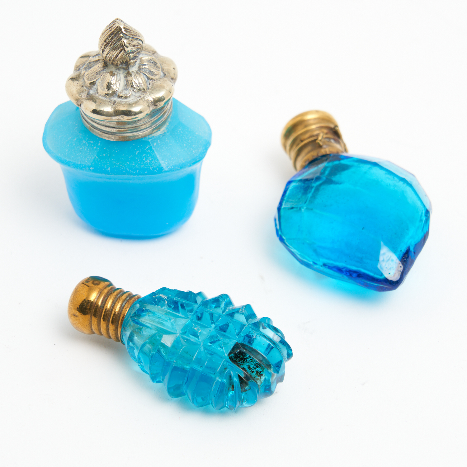 A COLLECTION OF THREE ANTIQUE BLUE GLASS PERFUME BOTTLE, ONE WITH SILVER TOP L.6.5CM