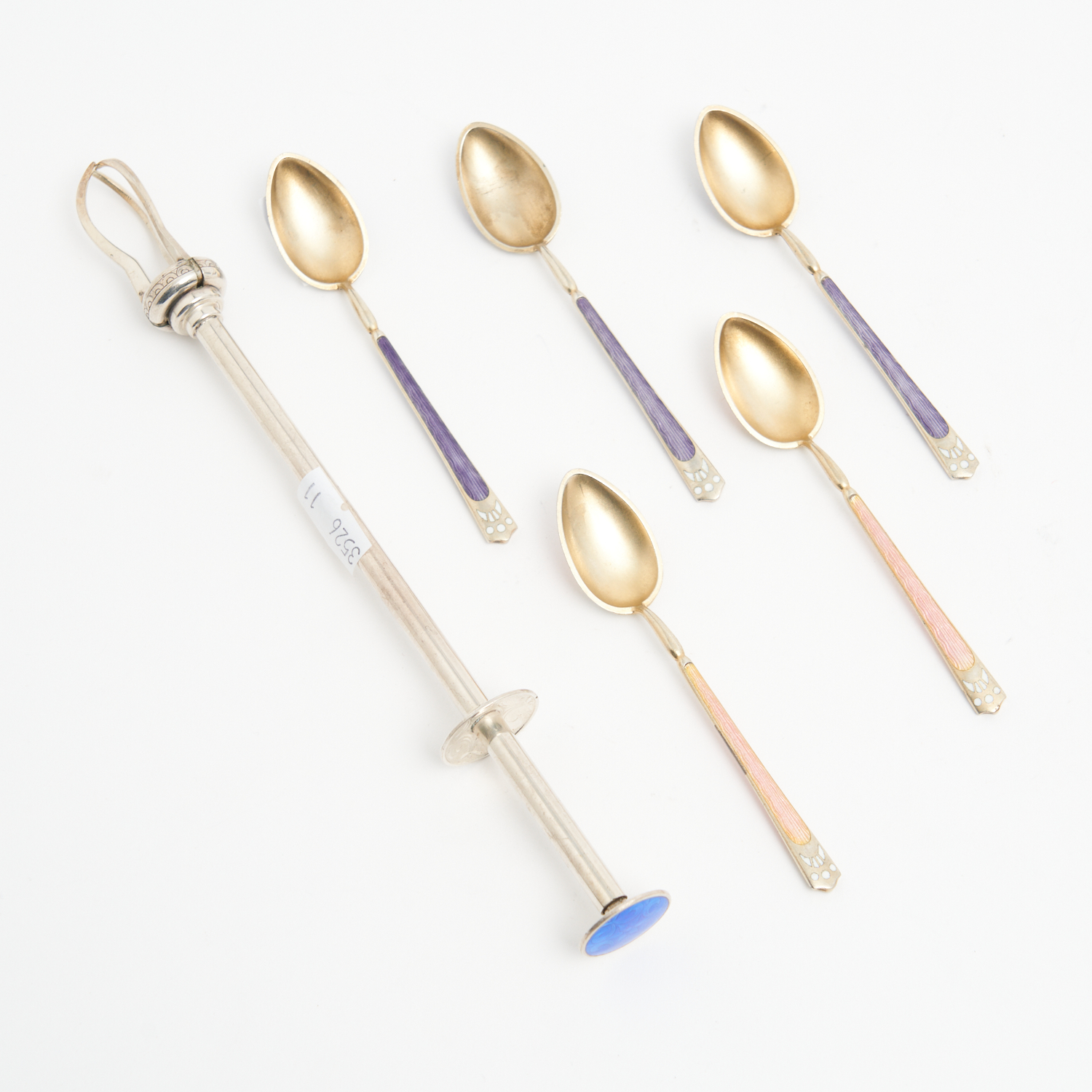 A SET OF FIVE STERLING SILVER AND GUILLOCHE ENAMEL TEA SPOONS (PLEASE NOTE, LOT ONLY INCLUDES THE FIVE SPOONS) L.9.5CM