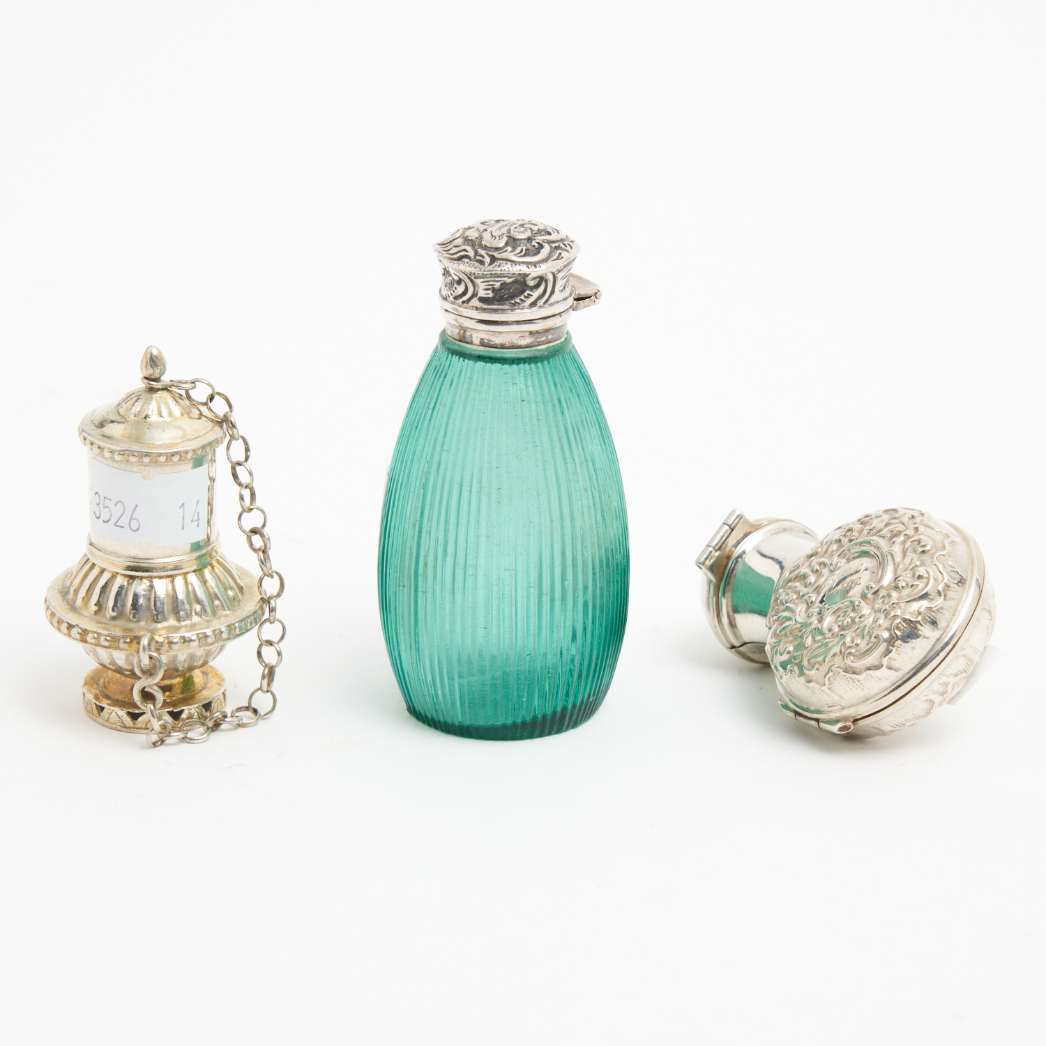 A GROUP OF THREE STERLING SILVER PERFUME BOTTLES INCLUDING ONE SILVER MOUNTED AND GREEN GLASS FLUTED H.8CM
