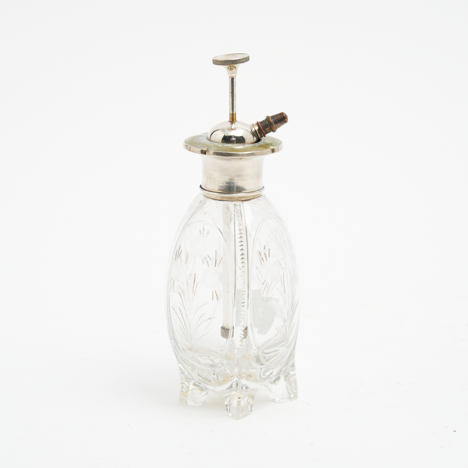 A STERLING SILVER GUILLOCHE ENAMEL TOPPED CRYSTAL PERFUME ATOMISER, ENGRAVED WITH FLOWERS H.12CM