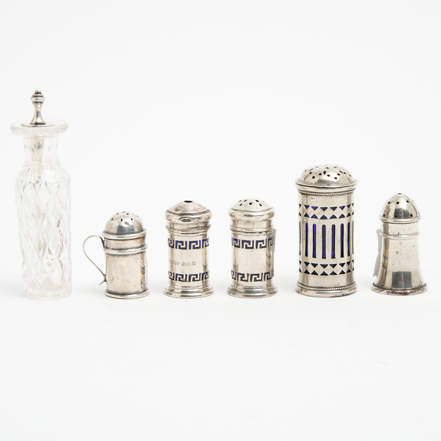A COLLECTION OF SIX STERLING SILVER AND SILVER MOUNTED CRUETS H.8CM (TALLEST)
