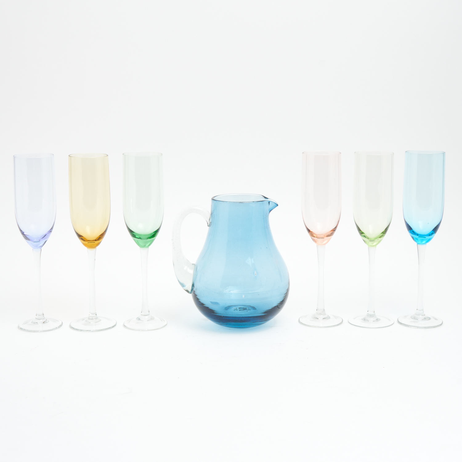 A HARLEQUIN COLOURED CHAMPAGNE FLUTE SET WITH BLUE GLASS JUG H.25CM
