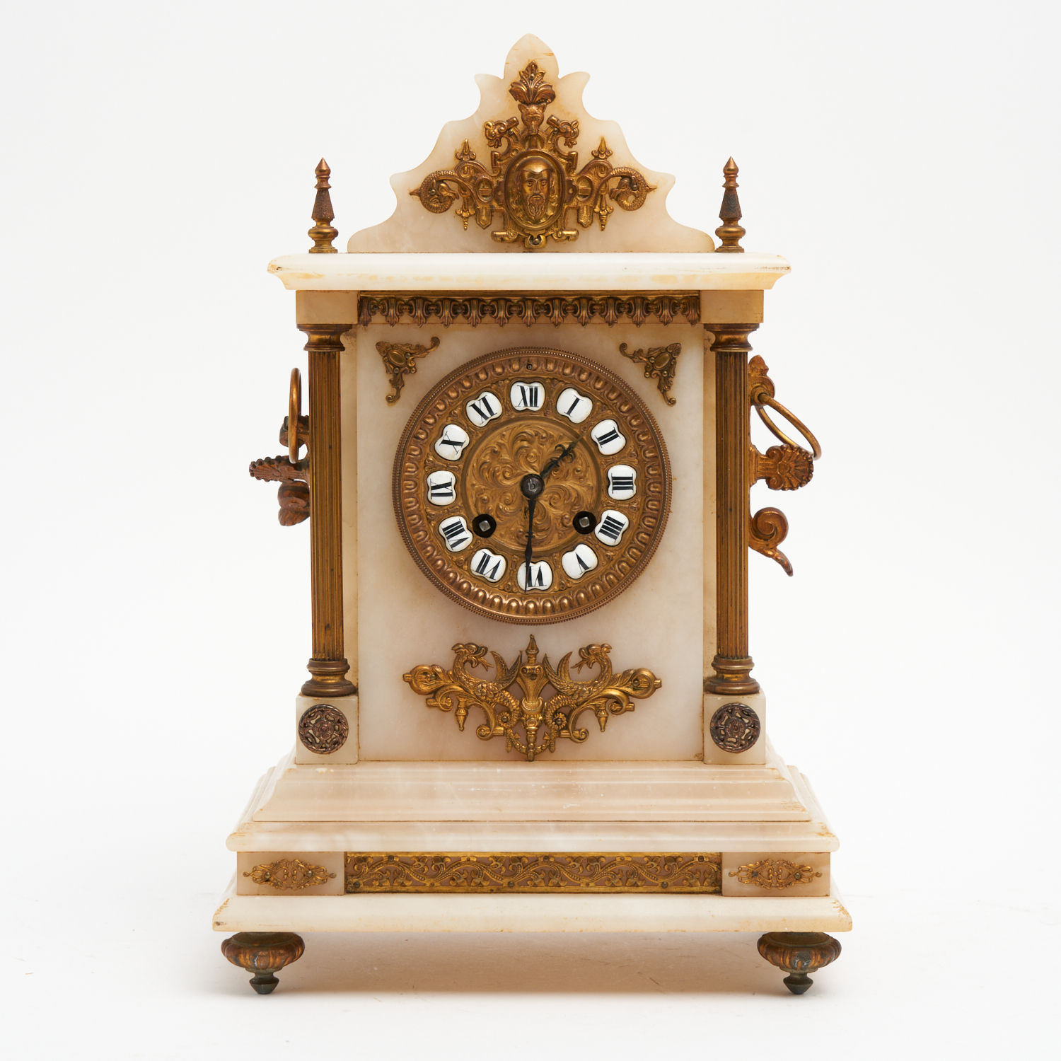 A 19TH CENTURY FRENCH GILDED BRONZE MOUNTED ALABASTER MANTLE CLOCK (WITH KEY AND PENDULUM) H.34CM (A/F)