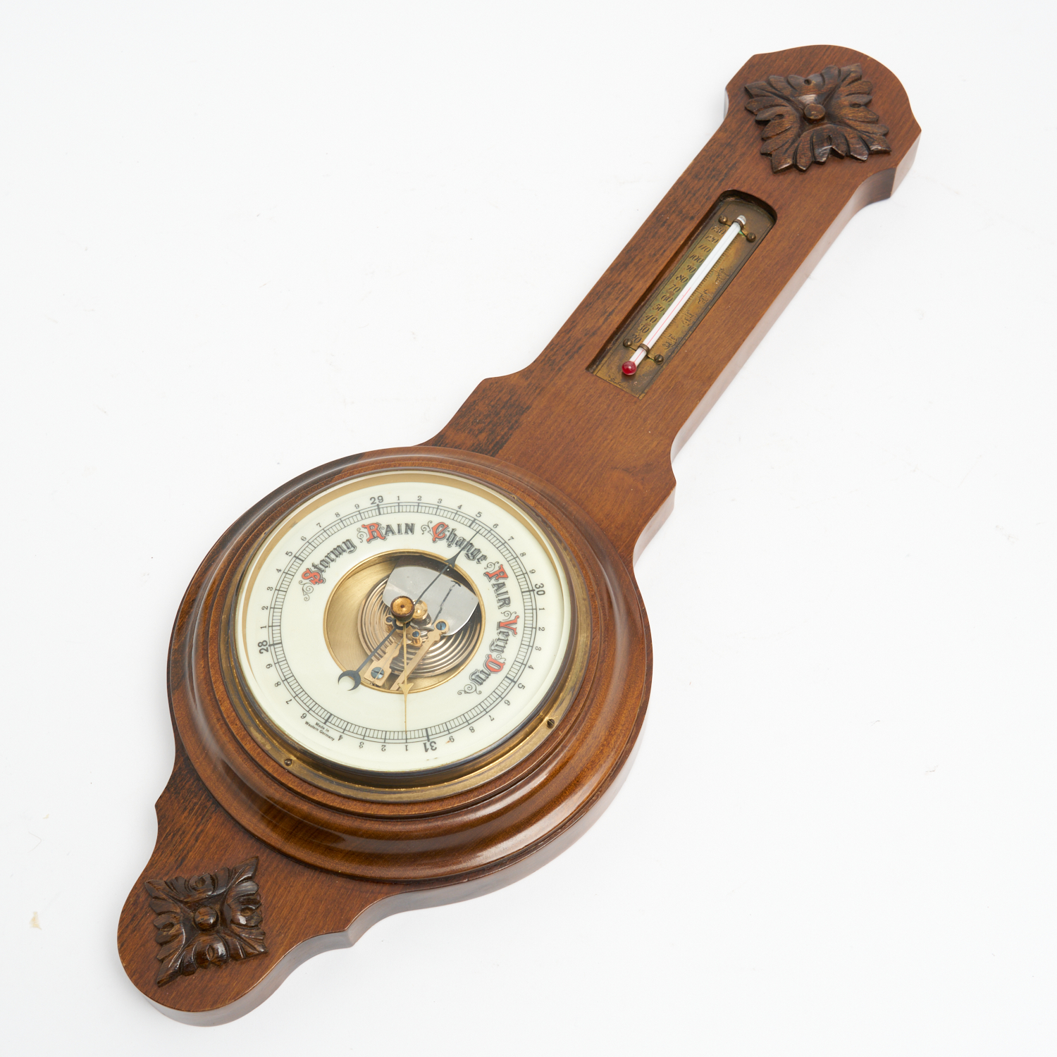 AN ANTIQUE GERMAN WALNUT BAROMETER AND THERMOMETER H.53CM
