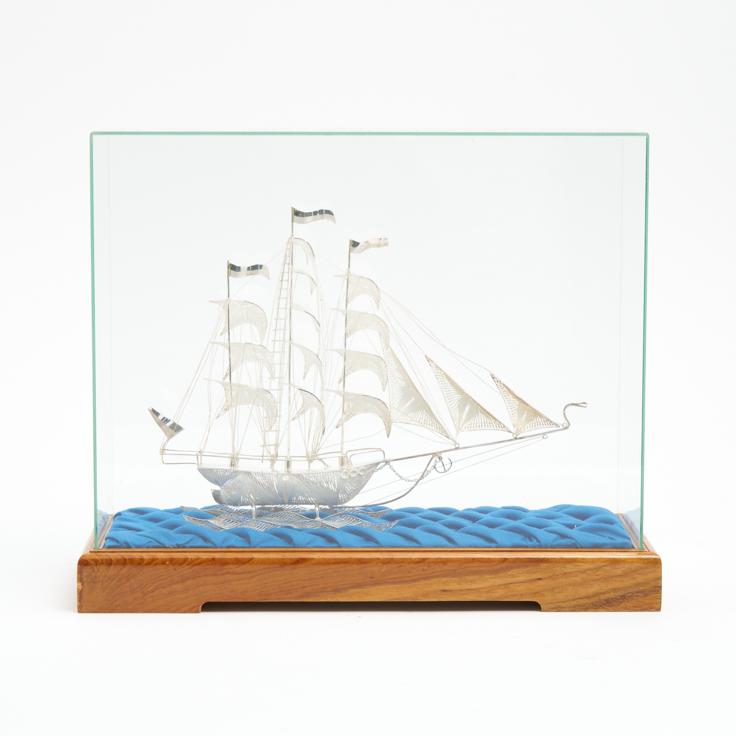 A STERLING SILVER MODEL OF A TALL SHIP, IN GLAZED WOODEN CASE L.30CM (CASE)