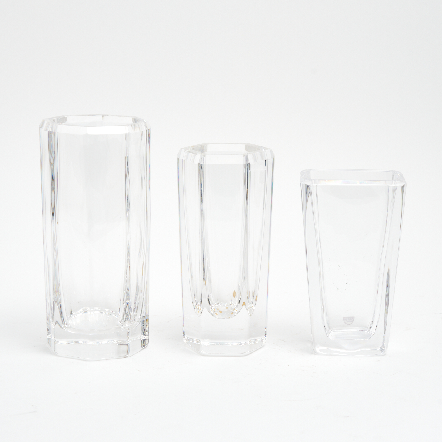 A GROUP OF THREE VASES INCLUDING ORREFORS AND KOSTA BODA H.22CM (TALLEST)