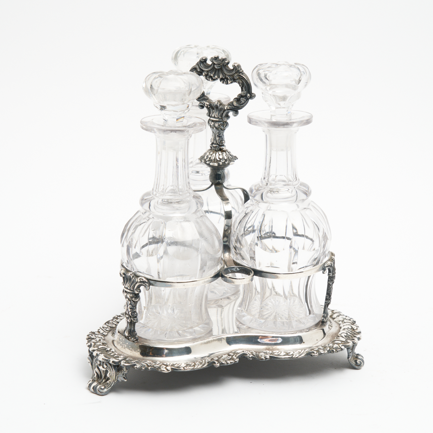 A 19TH CENTURY ENGLISH SHEFFIELD PLATE STAND WITH THREE CUT CRYSTAL DECANTERS H.29CM