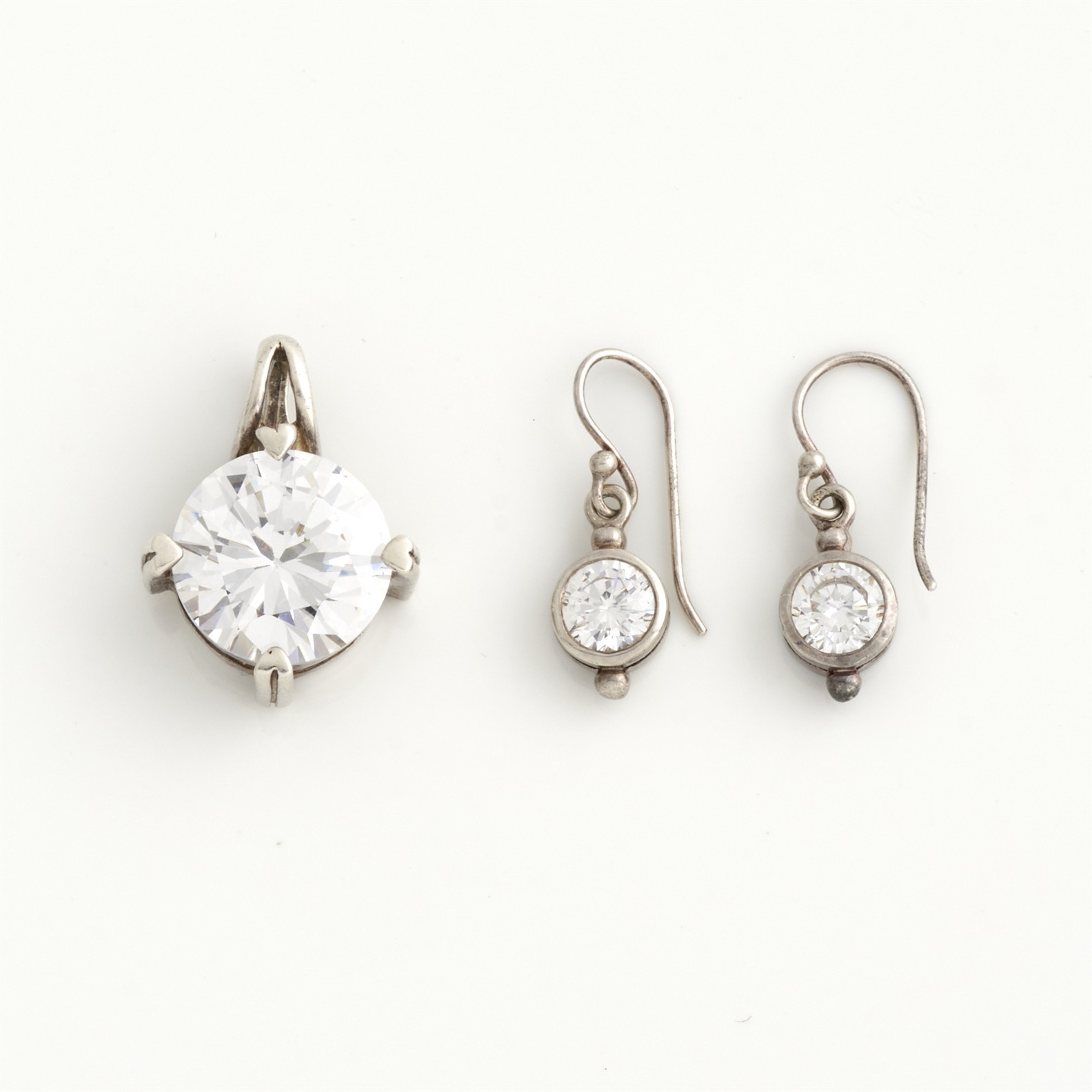 A CUBIC ZIRCONIA SET IN SILVER, COMPRISING A PENDANT 15MM X 25MM, TOGETHER WITH A PAIR OF EARRINGS, TO SHEPHERD HOOK FITTINGS, DROP LENGTH 25MM