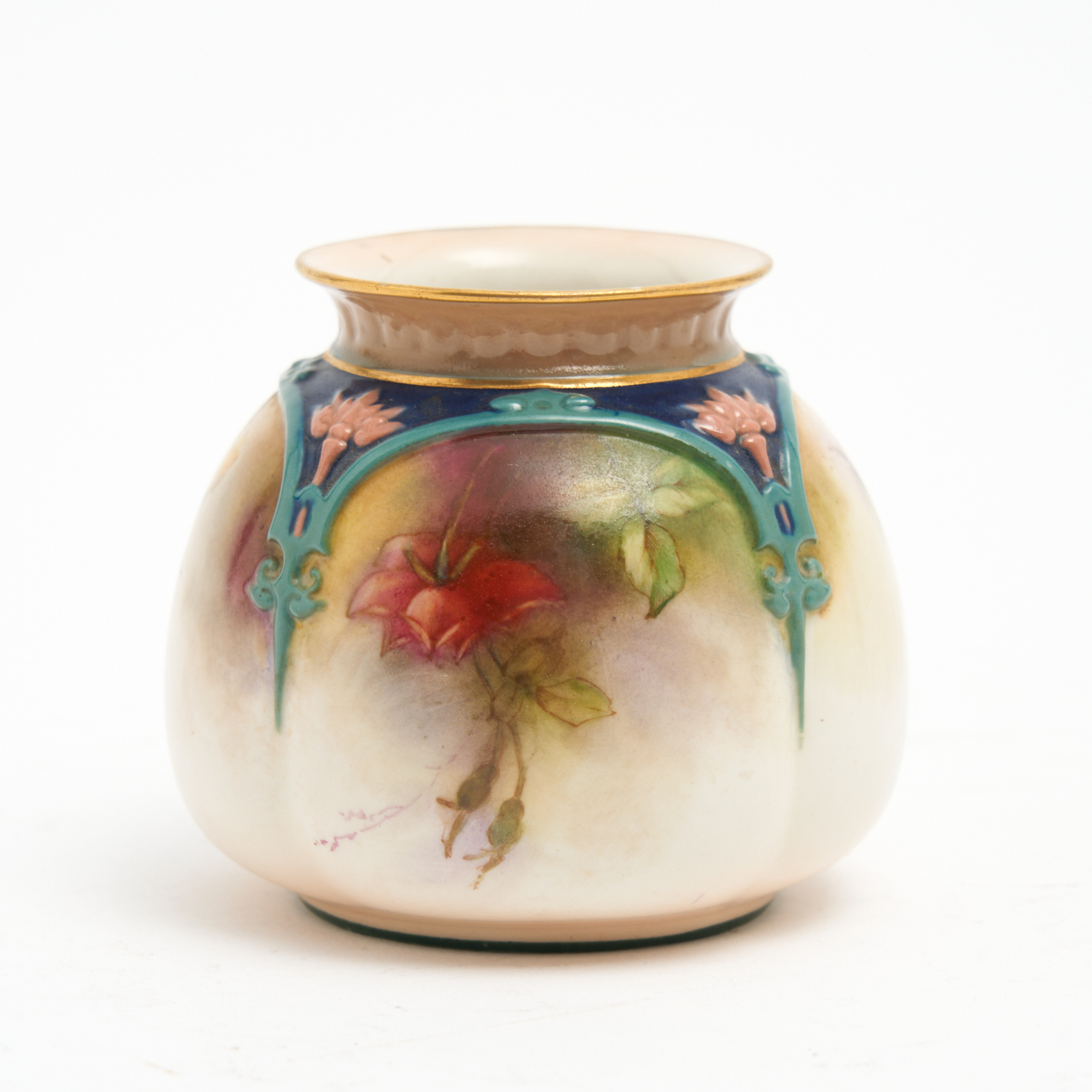 A SMALL ROYAL WORCESTER FLORAL PAINTED HADLEY WARE VASE H.7.5CM