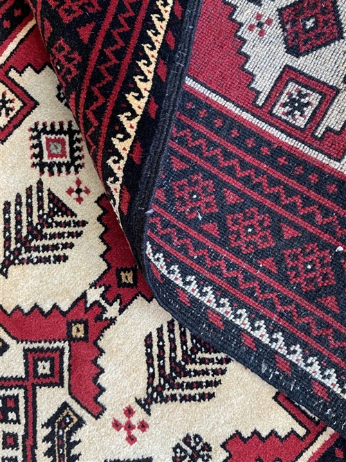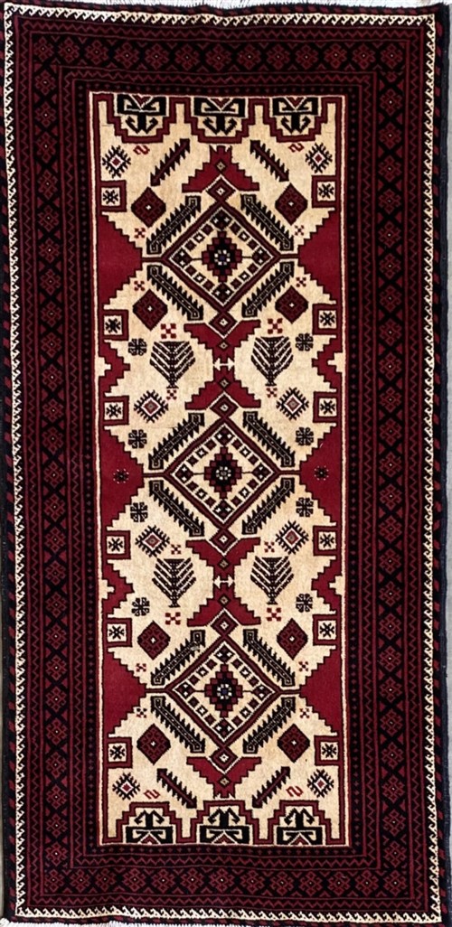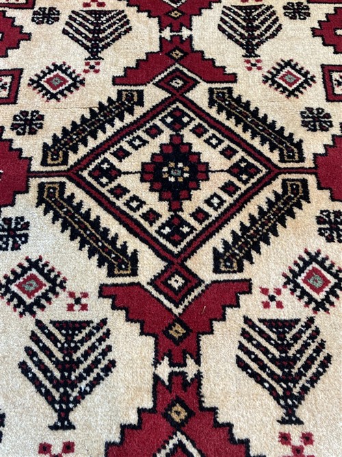 WOOL PILE. HAND-KNOTTED WEAVE FROM THE KHORASAN PROVINCE WITH TRIBAL DESIGN OF TRIPLE DIAMOND-SHAPED MEDALLIONS SET WITHIN CREAM FIELD OF TRIBAL & GEOMETRIC MOTIFS. BORDER OF REPEATING TRIBAL MOTIFS. THE ENTIRE IN SHADES OF CREAM, RED & BLACK.