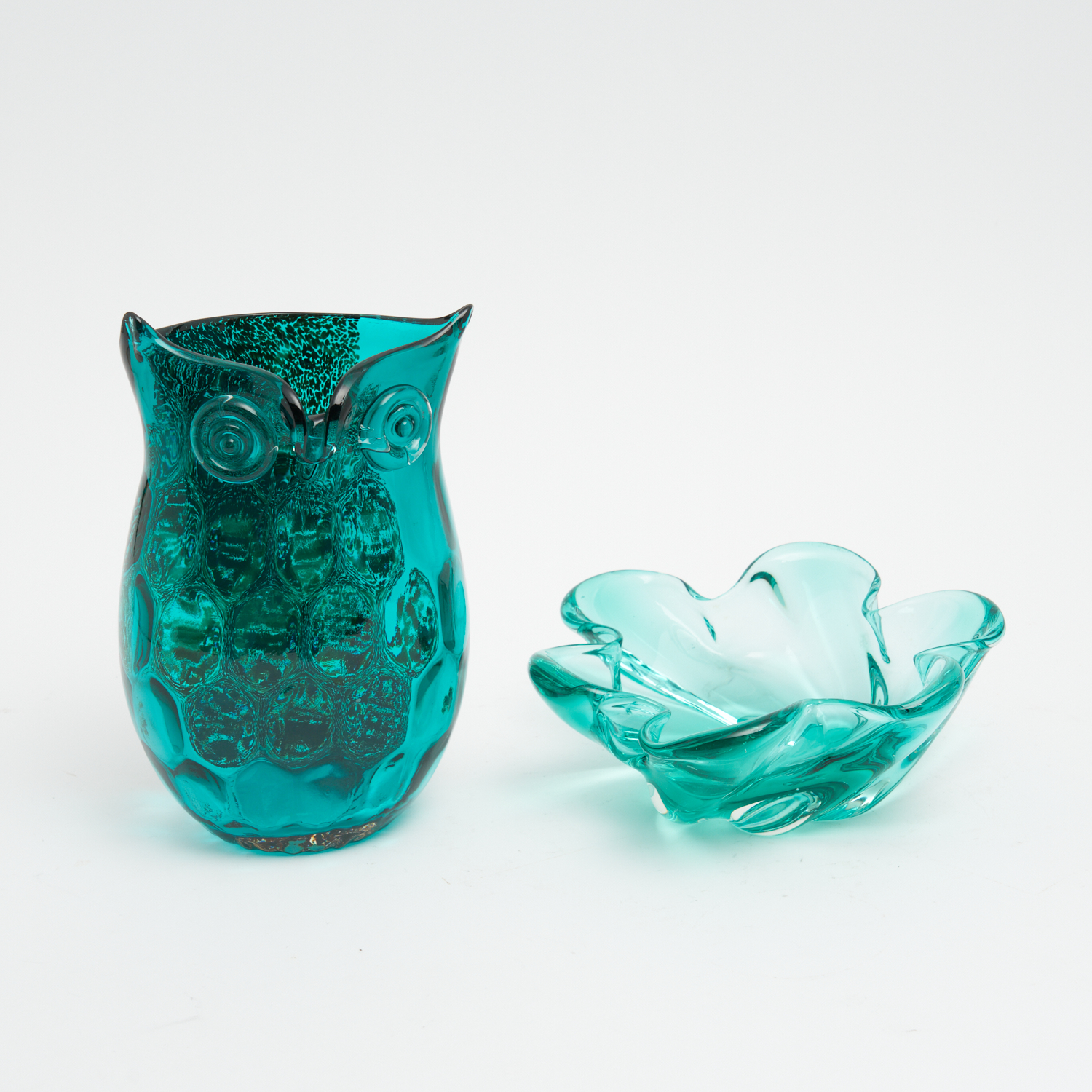 TWO PIECES OF GREEN ART GLASS INCLUDING AN OWL FORM VASE AND A FREE-FROM BOWL H.21CM (TALLEST)