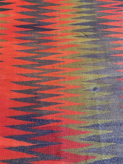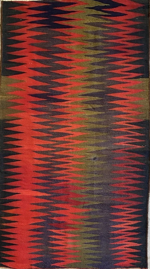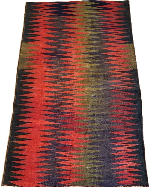 WOOL AND NATURAL VEGETABLE DYES. HAND WOVEN NOMADIC WEAVE FROM THE SOUTHERN PERSIAN FARS PROVINCE WITH AN ALL-OVER GEOMETRIC-PATTERNED DESIGN IN VIBRANT SHADES.