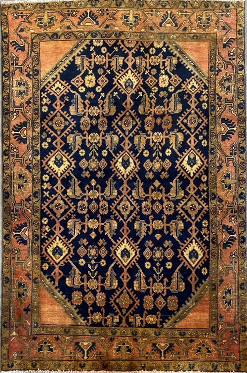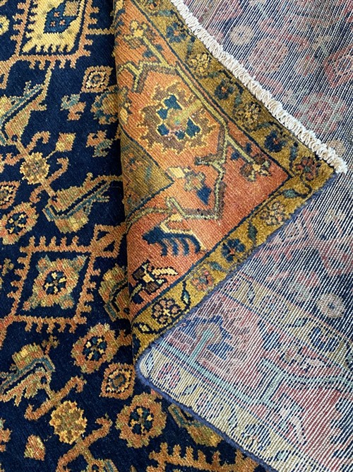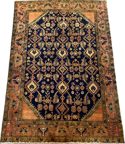 A HAND WOVEN NOMADIC WEAVE FROM THE LORESTAN PROVINCE WITH WOOL AND VEGETABLE DYES & NATURAL ABRASH COLOUR VARIATION. NOMADIC DESIGN OF ALL-OVER BOLD HERATI MAHI PATTERNS IN AN INDIGO FIELD. BORDER OF PALMETTES.