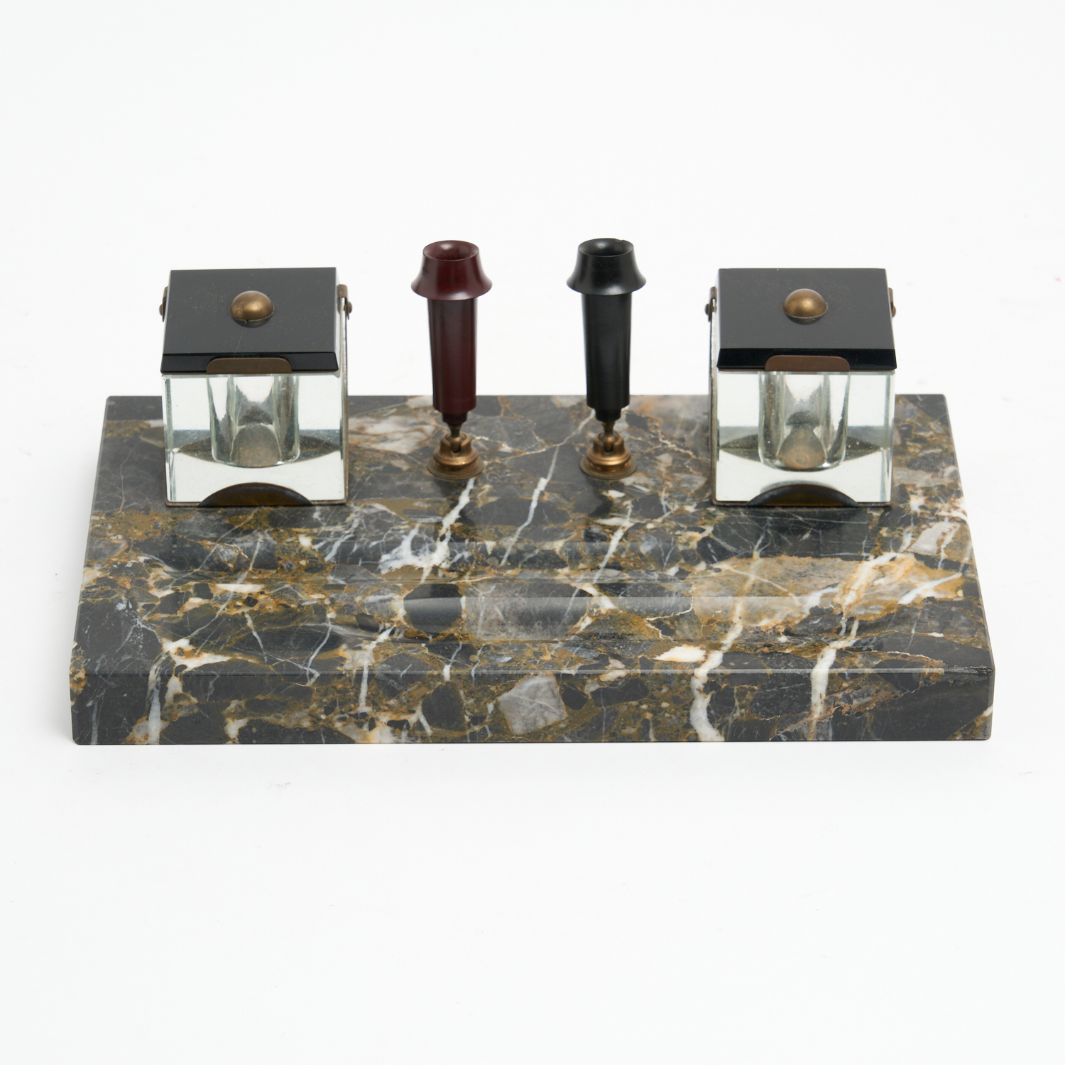 AN ART DECO MARBLE AND GLASS/CRYSTAL DUAL INKWELL (A/F) L.27CM