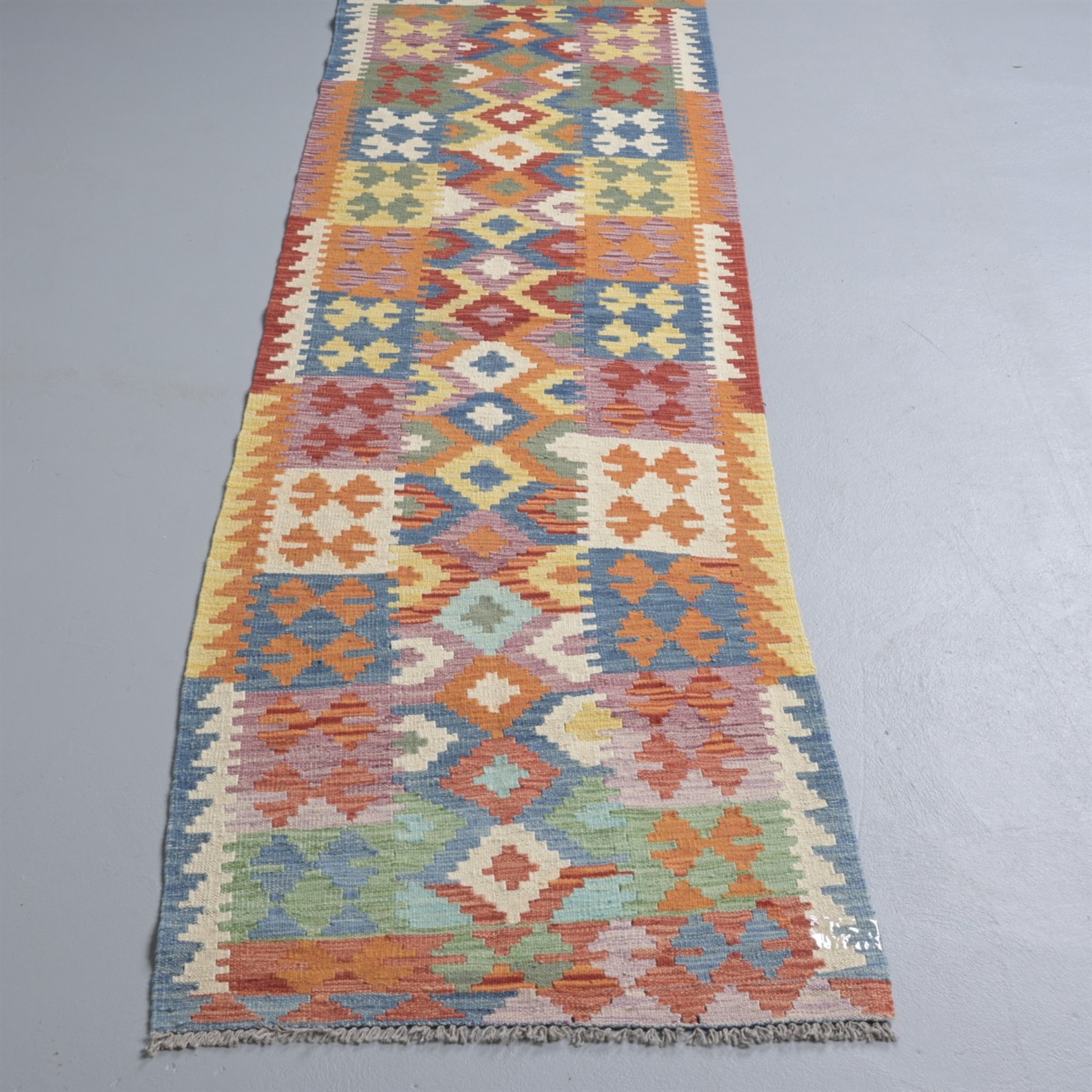 AN AFGHAN HANDSPUN WOOLLEN RUNNER, MADE WITH VEGETABLE DYES (302CM H 82CM W)