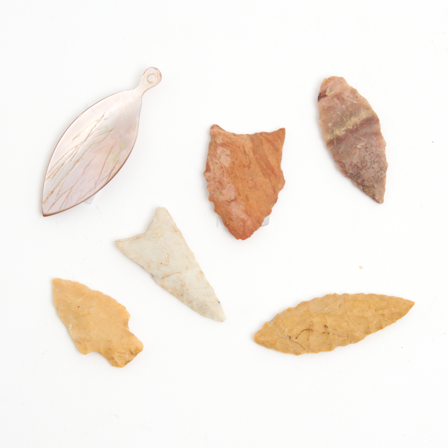 A GROUP OF FIVE ANTIQUE STONE ARROWHEADS TOGETHER WITH A CARVED MOTHER-OF-PEARL PENDANT 4.2CM (LONGEST)