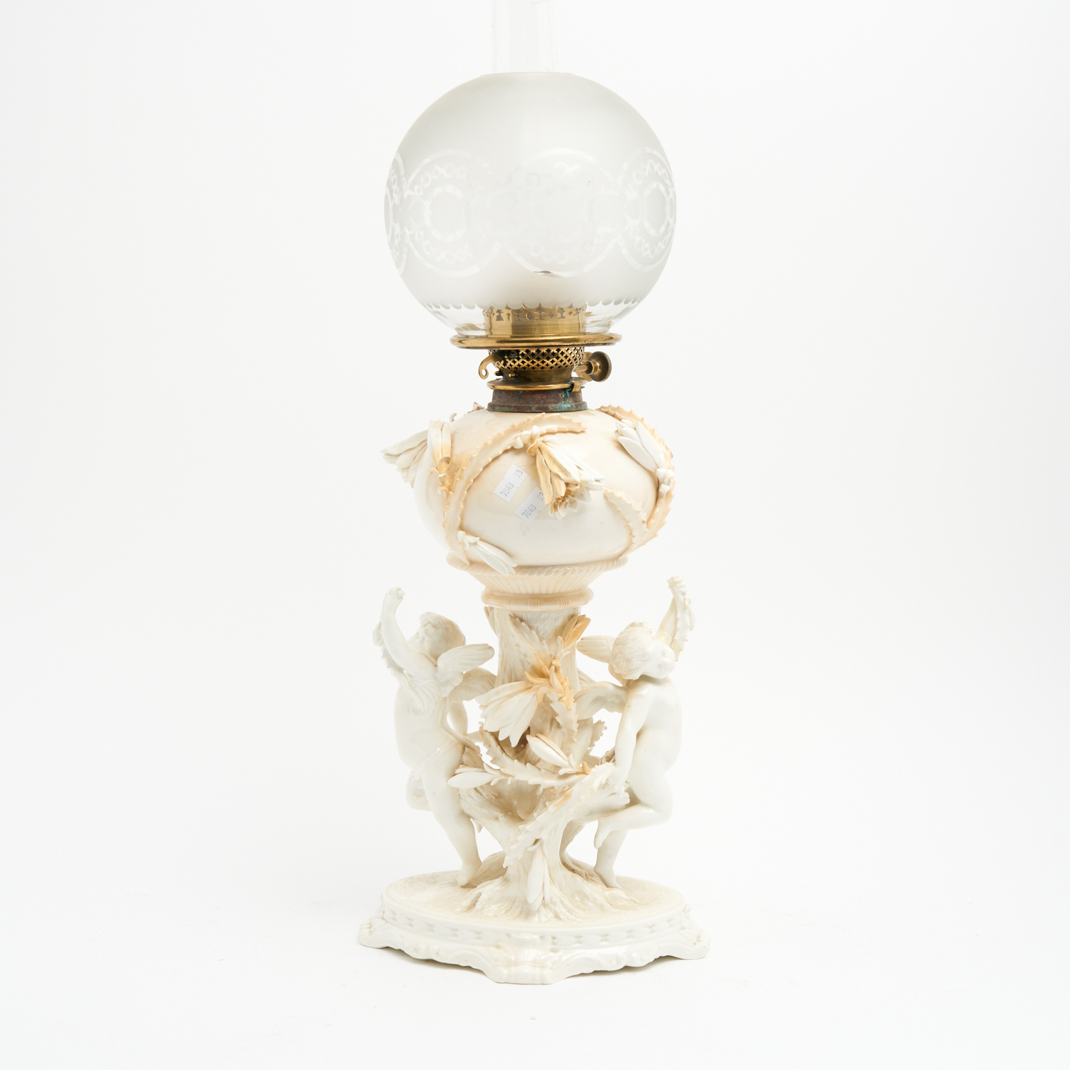 AN ENGLISH PORCELAIN KEROSENE LAMP BASE ADORNED WITH CHERUBS, WITH SHADE AND FLU (A/F) H.68CM