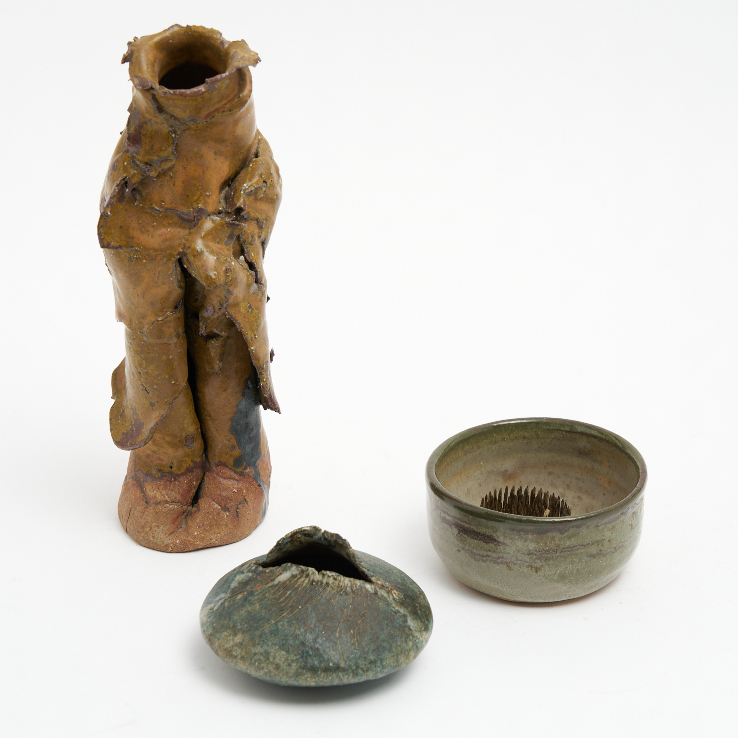 THREE PIECES OF AUSTRALIAN STUDIO POTTERY INCLUDING A SMALL VASE POSSIBLY SIGNED 'SILVIA HALPERN', A FREE-FORM VASE, AND A BOWL SIGNED 'GLENDA' H.27.5CM