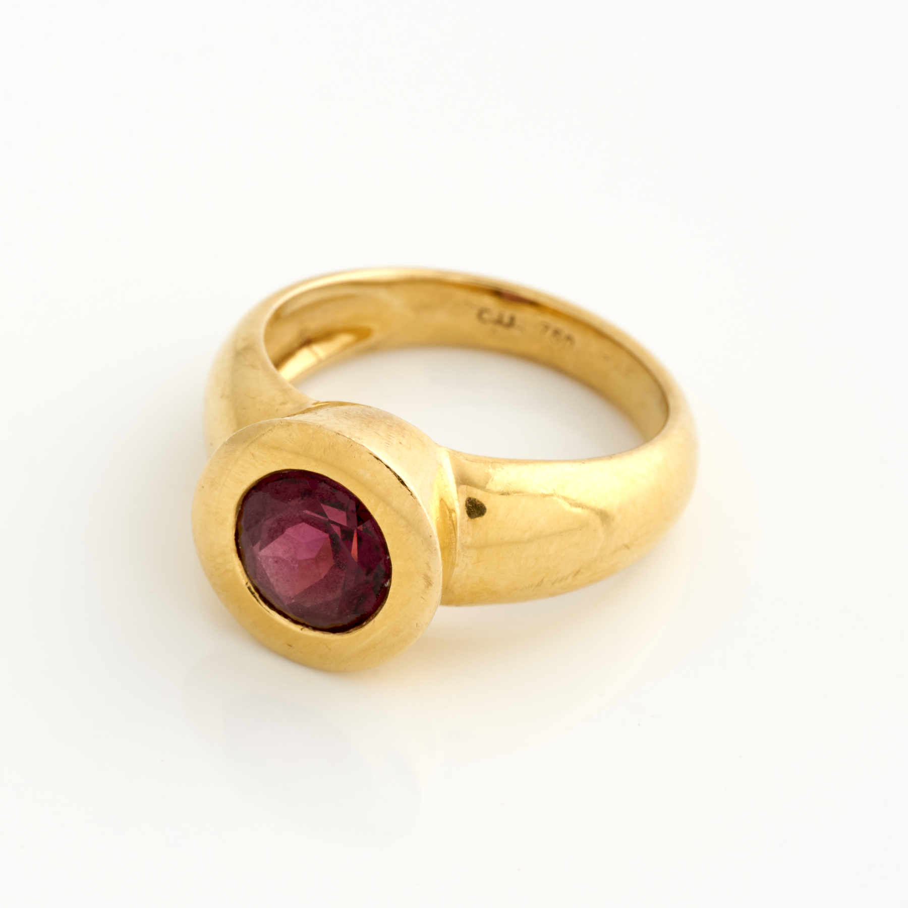 A RHODOLITE GARNET RING IN 18CT GOLD, SIZE O, 10.50GMS