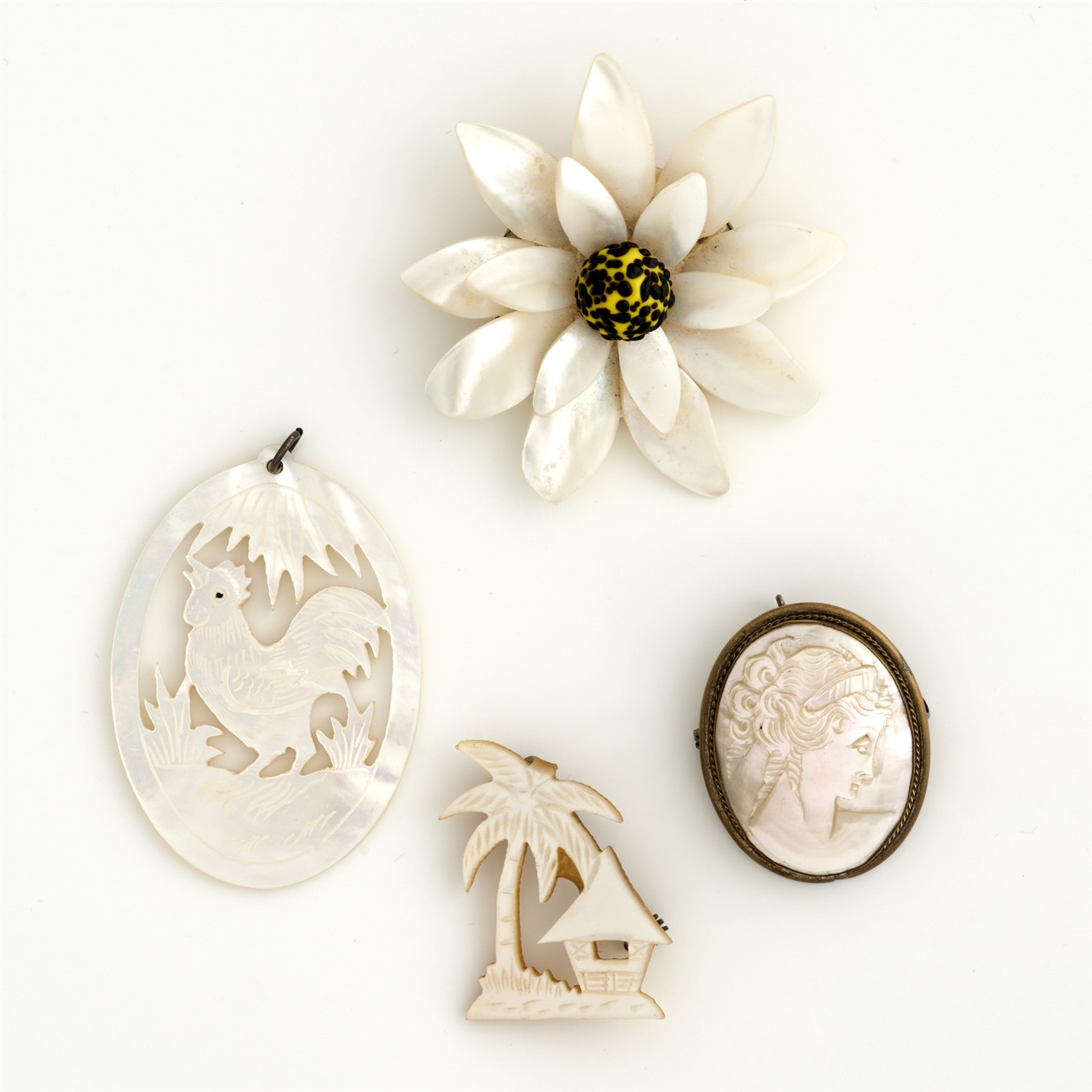 A COLLECTION OF MOTHER OF PEARL JEWELLERY, COMPRISING THREE BROOCHES, THE LARGEST MEASURING 55MM X 55MM, TOGETHER WITH A PENDANT 55MM X 40MM