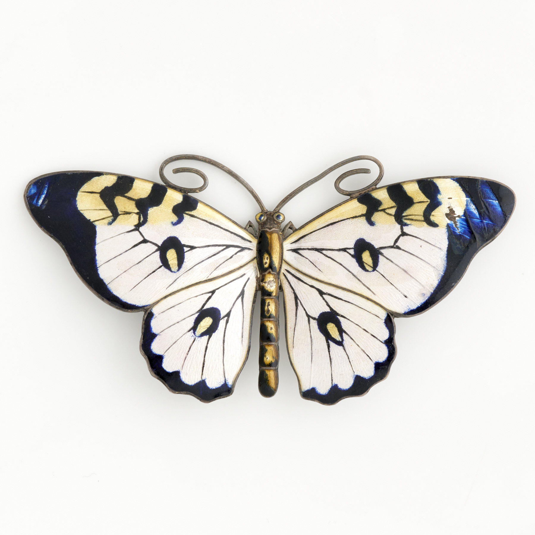 AN ENAMEL BUTTERFLY BROOCH IN STERLING SILVER, 80MM X 40MM