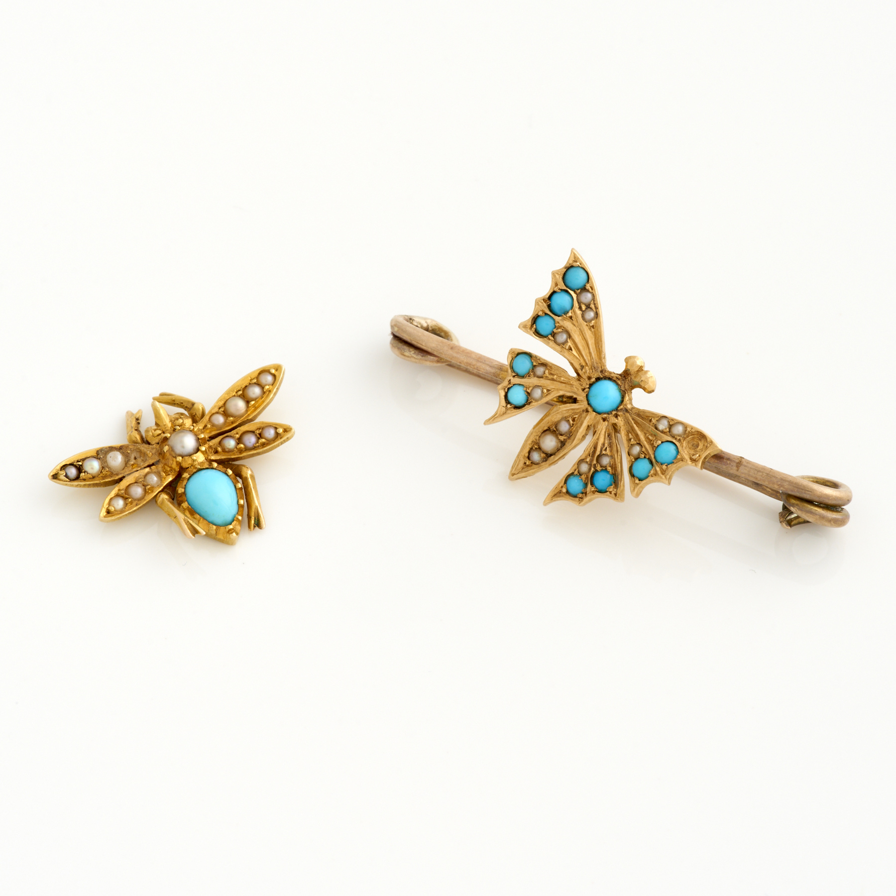A TURQUOISE AND SEED PEARL BUTTERFLY BROOCH IN 9CT AND 14CT GOLD, 40MM X 20MM, TOGETHER WITH A TURQUOISE AND SEED PEARL BEE MOTIF PENDANT IN 14CT GOLD, 14MM X 18MM, (A/F), TOTAL WEIGHT 4.26GMS