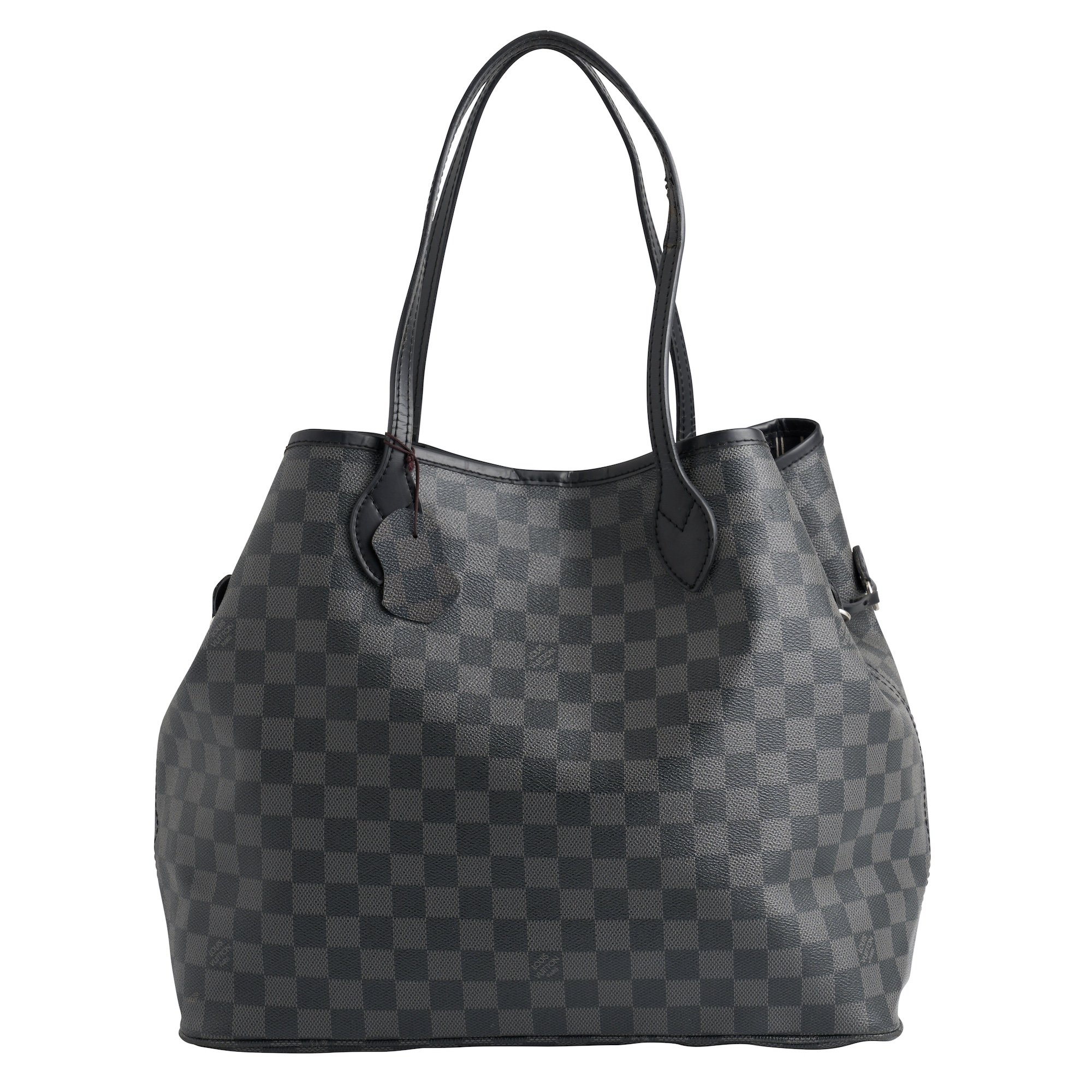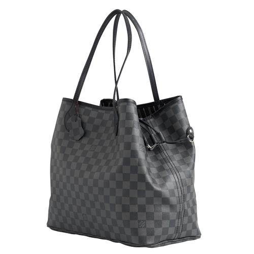 Styled coated Damier Graphite canvas with black leather trim and silver tone hardware, measures 37 x 32 x 20 cm.