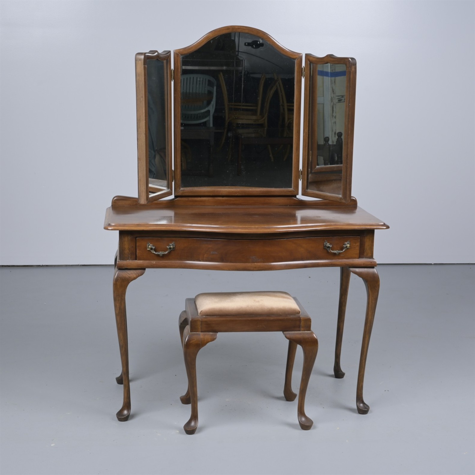 A MID-20th CENTURY MAHOGANY DRESSING MIRROR WITH A STOOL (148CM H X 106CM W X 46CM D)