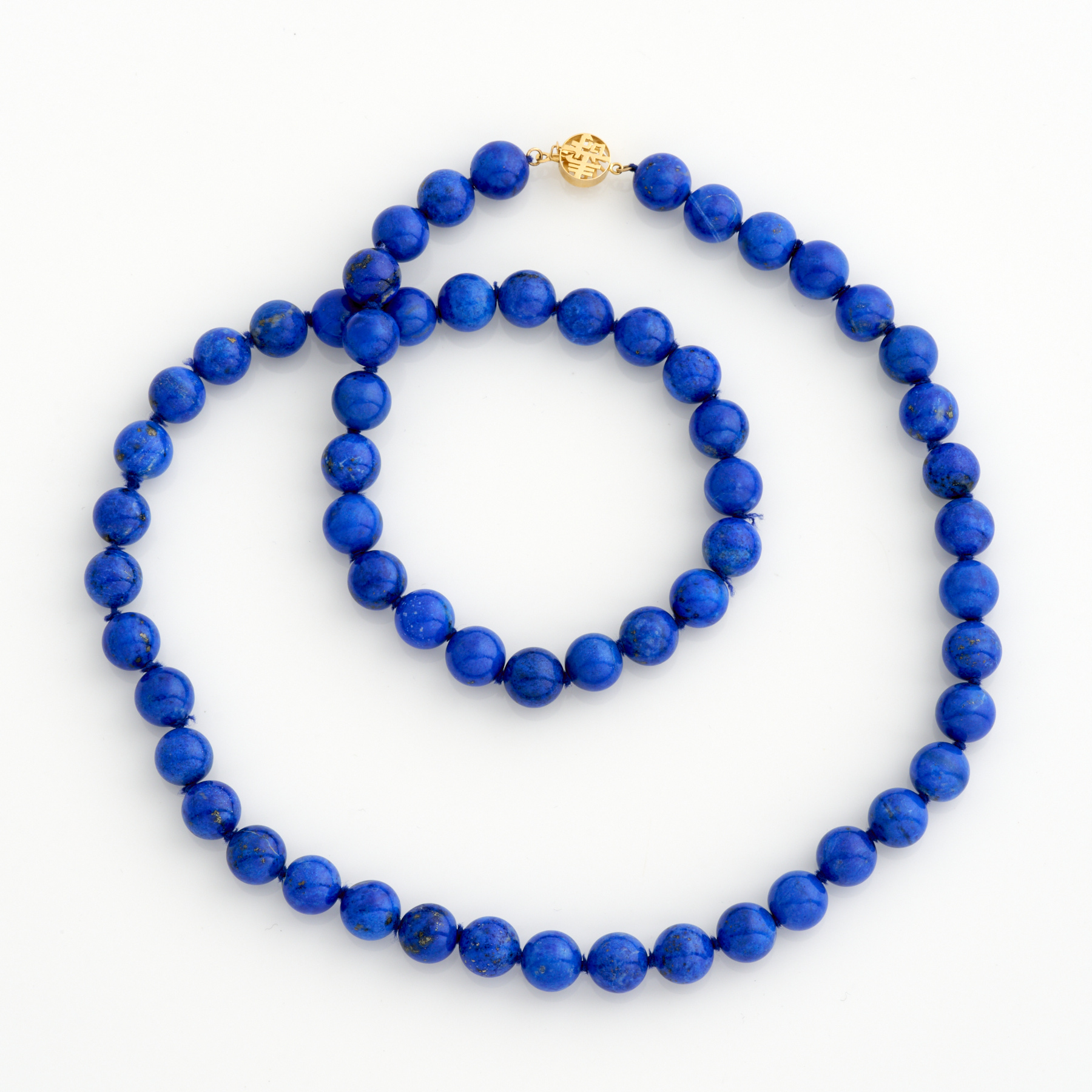 A STRAND OF LAPIS LAZULI BEADS, TO A CLASP IN 14CT GOLD, 640MM