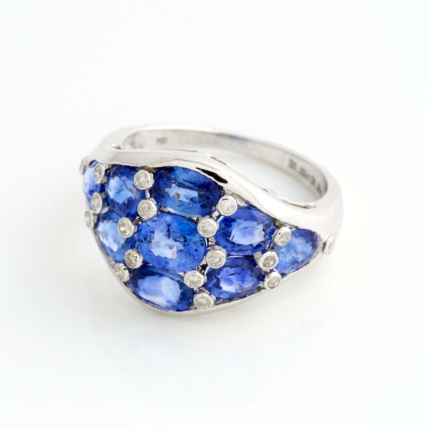 A SAPPHIRE AND DIAMOND RING IN 18CT WHITE GOLD, THE SAPPHIRES TOTALLING APPROXIMATELY 8.30CTS, THE DIAMONDS TOTALLING APPROXIMATELY 0.22CTS, SIZE O, 6.4GMS