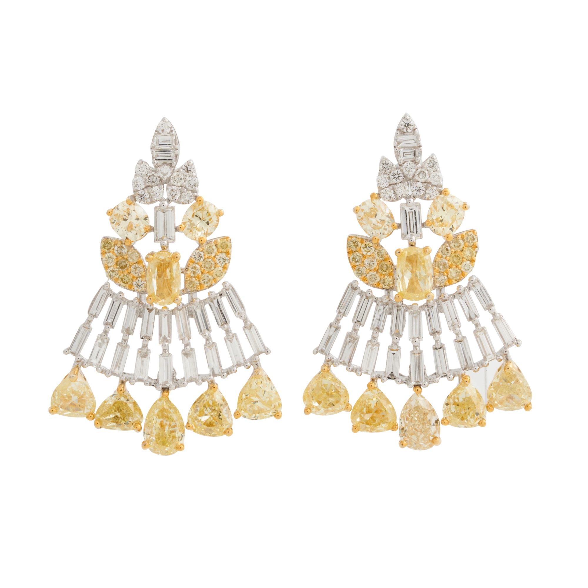 Each earring of triangular shape, comprising a cluster of claw-set vari-cut yellow and colourless diamonds, suspending a double row of baguette-cut diamonds and pear-cut yellow diamonds, to yellow diamonds together weighing approximately 2.82 carats, the diamonds together weighing approximately 1.82 carats, to post and butterfly fittings, length 33mm, width 22mm, gross weight approximately 7.4 grams.
