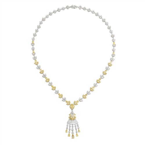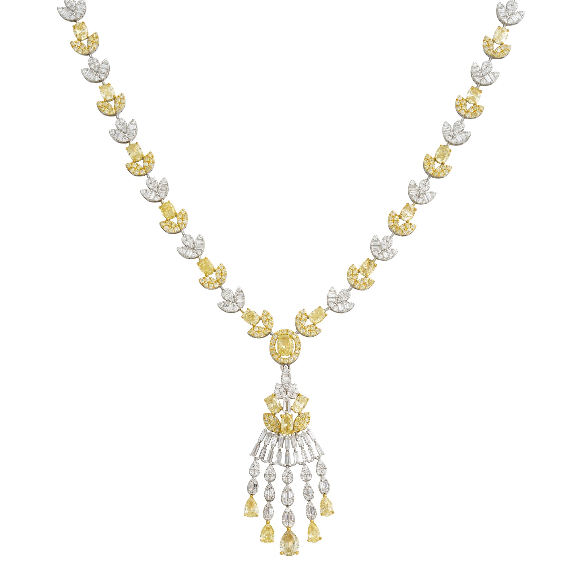 The diamond necklace of alternating yellow and white diamonds in pavé-set floral motif links of graduating diamonds, centring to a claw-set oval modified brilliant-cut diamond, further surrounded by a halo of claw-set fancy yellow diamonds suspended above a detachable pendant of pear shaped , oval and baguette cut diamonds, the diamonds together weighing approximately 13.45 carats, length approximately 450mm, pendant length 60mm, gross weight approximately 24.0 grams.