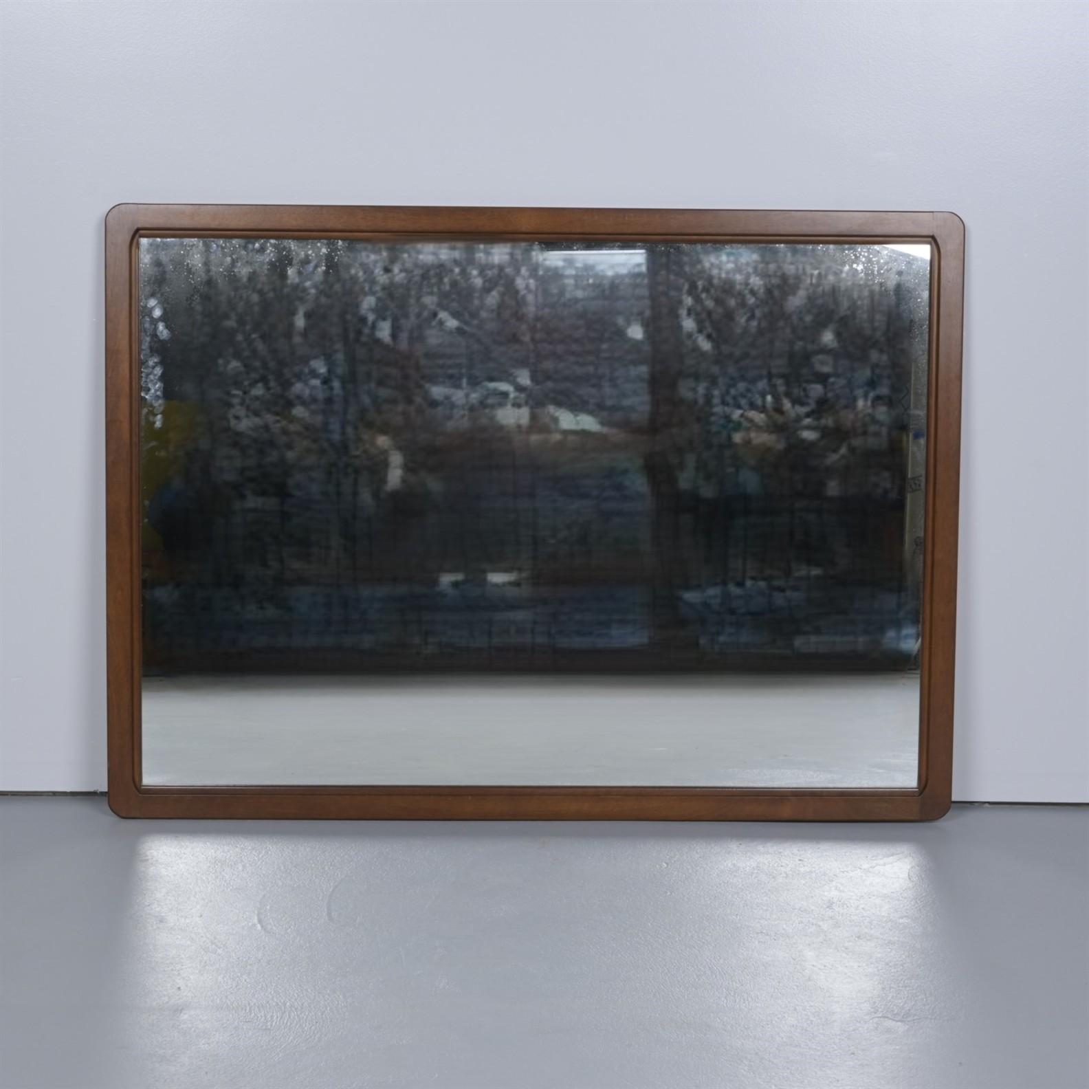 A LARGE MIRROR IN TEAK FRAME (A/F) (111CM H X 153CM W)