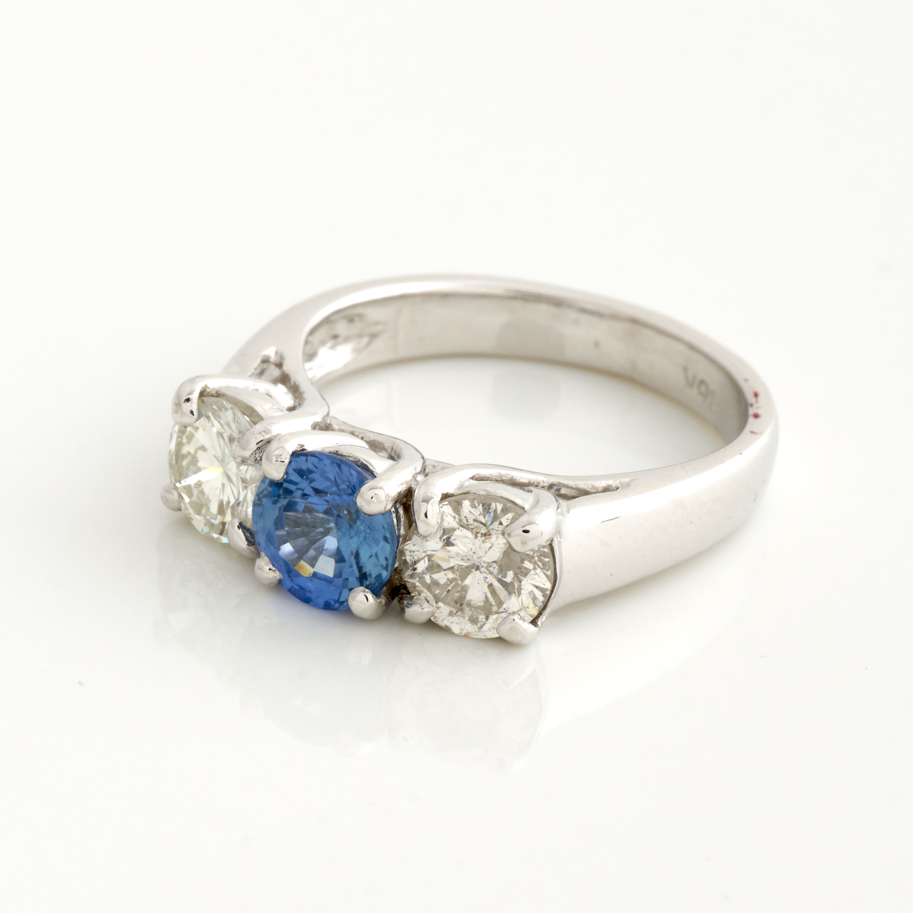 A SAPPHIRE AND DIAMOND RING IN 18CT WHITE GOLD, THE SAPPHIRE WEIGHING 1.18CTS, THE DIAMONDS TOTALLING APPROXIMATELY 1.40CTS, SIZE L1/2, 5.33GMS, ACCOMPANIED BY A VALUATION