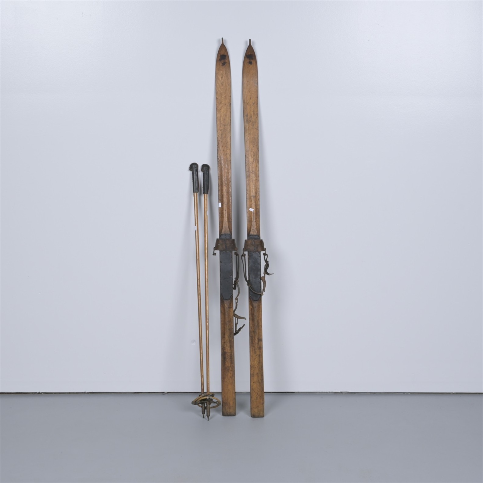 A PAIR OF WOODEN SNOW SKIS AND MATCHED CANE AND METAL POLES (182CM H)
