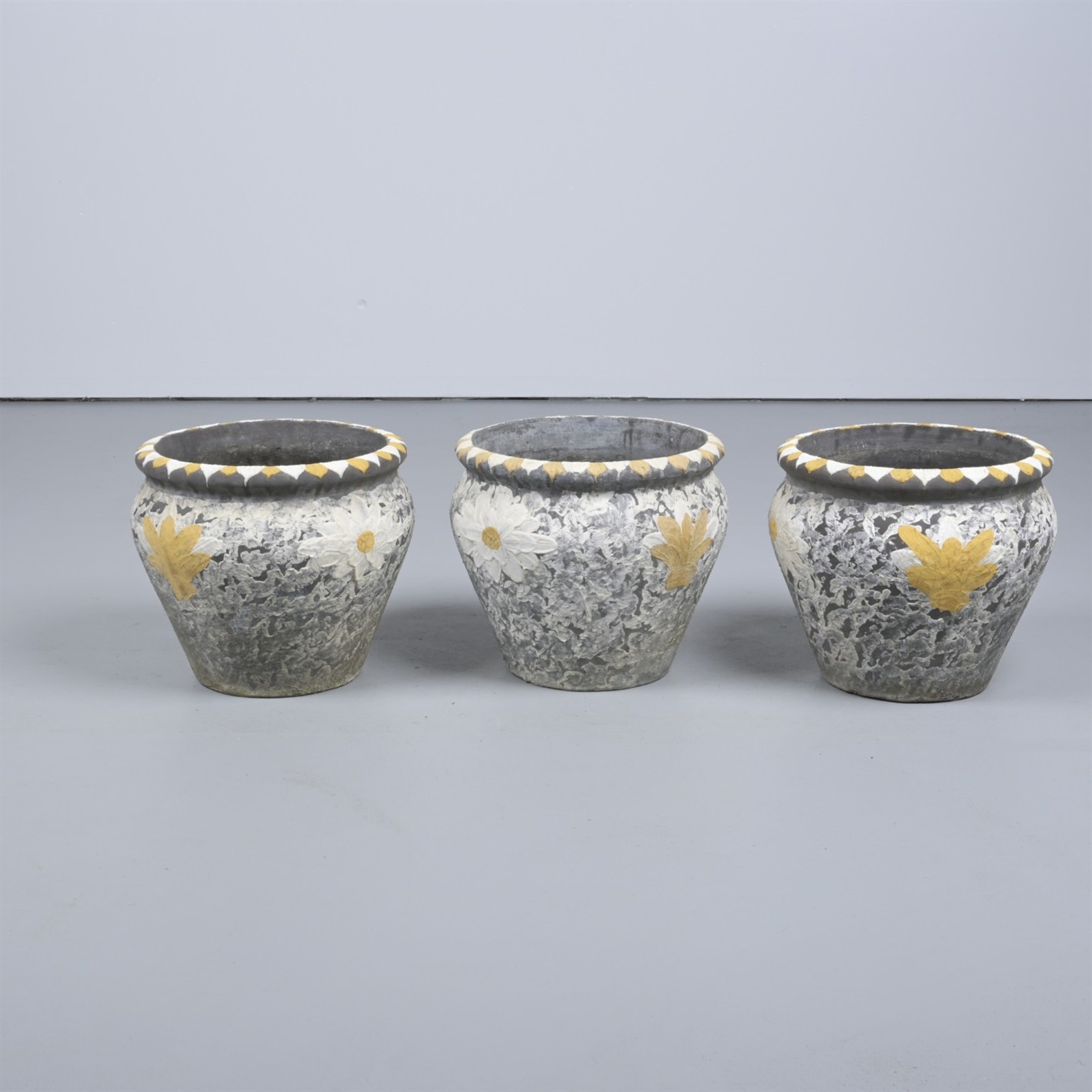 A GROUP OF THREE PAINTED CONCRETE PLANTER POTS (40CM H X 43CM DIA) (THIS ITEM MUST BE REMOVED BY PROFESSIONAL CARRIERS OR CLIENTS. LEONARD JOEL STAFF CANNOT ASSIST WITH CARRYING OR DELIVERY OF THIS ITEM)