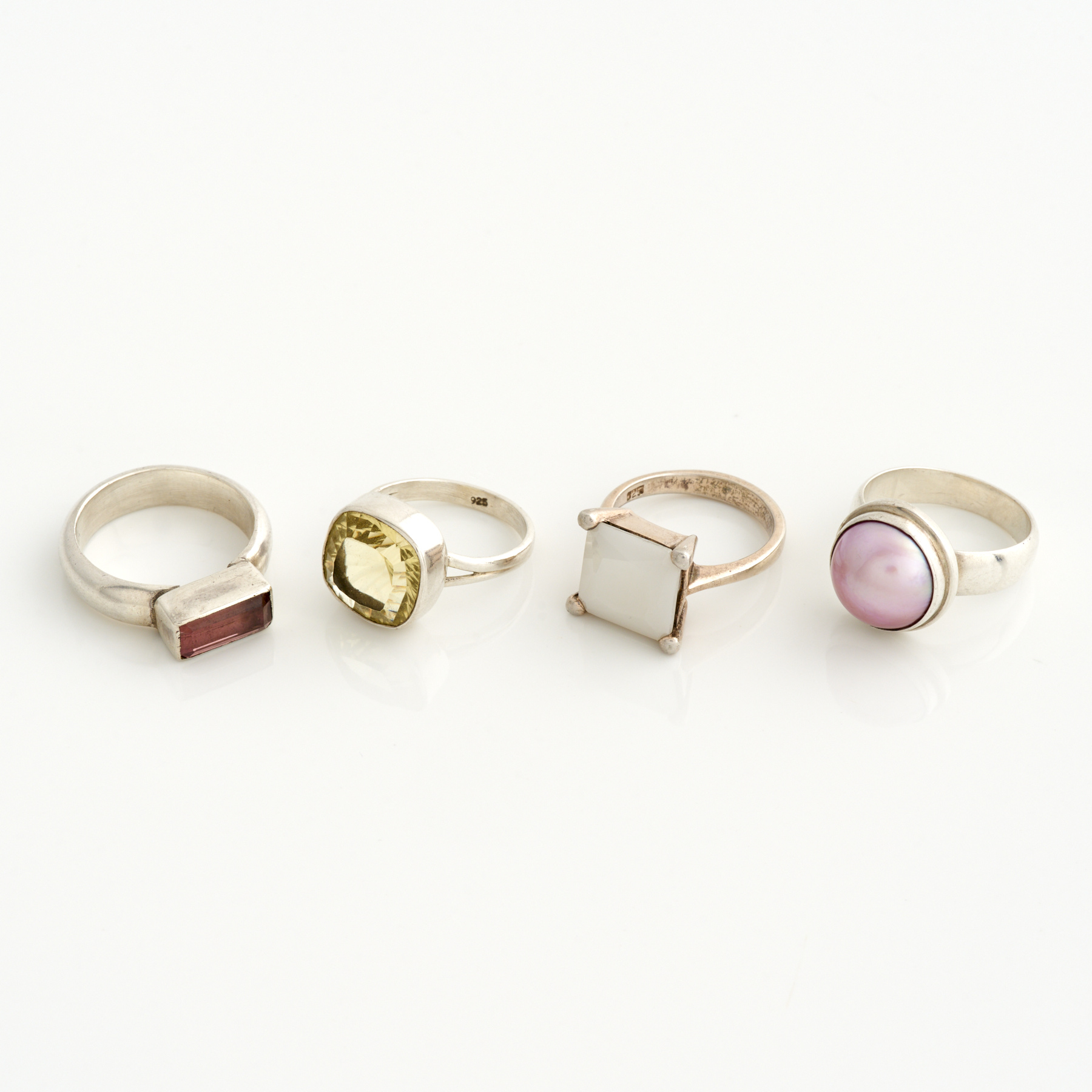 A COLLECTION OF FOUR GEM SET RINGS IN STERLING SILVER, THE LARGEST A SIZE Q